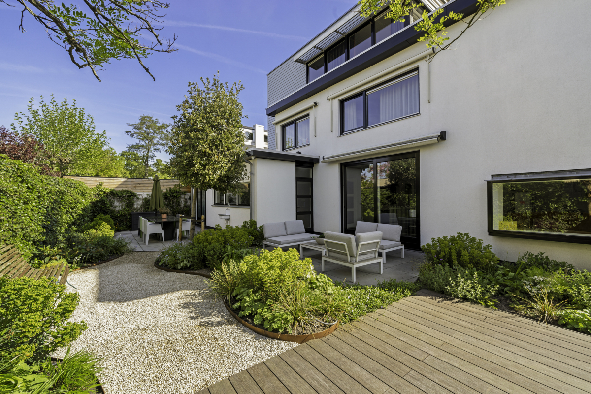 Through the beautiful entrance, you enter the spacious and bright hallway with a wardrobe, meter cupboard, and separate toilet. Double doors lead to the generous living room of approximately 65 m², featuring a marble floor with underfloor heating, a gas fireplace, and French doors leading to the sunny garden. At the front of the house is a work or study area overlooking the quiet street. The luxurious kitchen/ding room has been completely renovated and is equipped with high-quality Siemens appliances, including an induction cooktop with a 5-burner stove and oven, a wine cooler, a Quooker, a combination microwave, a built-in espresso machine, and a fridge-freezer with ice and water dispenser. Thanks to the air conditioning and the spacious dining area, this is a wonderful space for cooking and dining with family or guests. Adjacent is the utility room, featuring a custom-built pantry with connections for a washing machine and dryer. The garage, equipped with underfloor heating and an electric garage door, is also accessible from here.