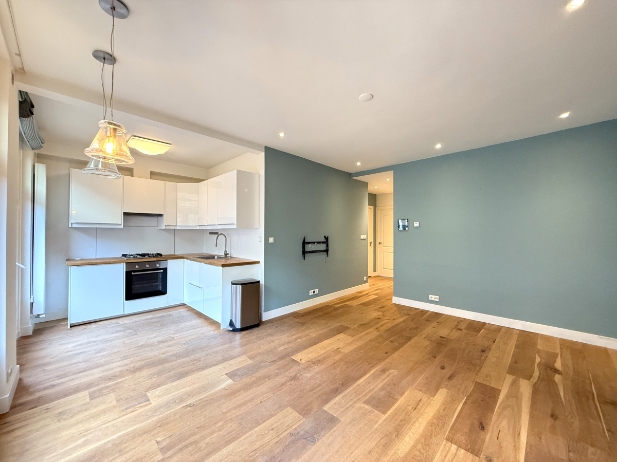 Central entrance with entrance of the apartment on the 1st floor. Bright living room with original stained glass details and open kitchen with various built-in appliances, including a fridge / freezer, oven, dishwasher, gas hob with extractor. Three sets of double doors to the balconies at the front. The 2 bedrooms are located at the rear and both offer access to a wonderful balcony on the sunny west. The modern bathroom has a bathtub, a separate walk-in shower and a sink. The washing machine and dryer are also set up in the bathroom. Separate toilet with hand basin. The entire apartment has a beautiful wooden floors.