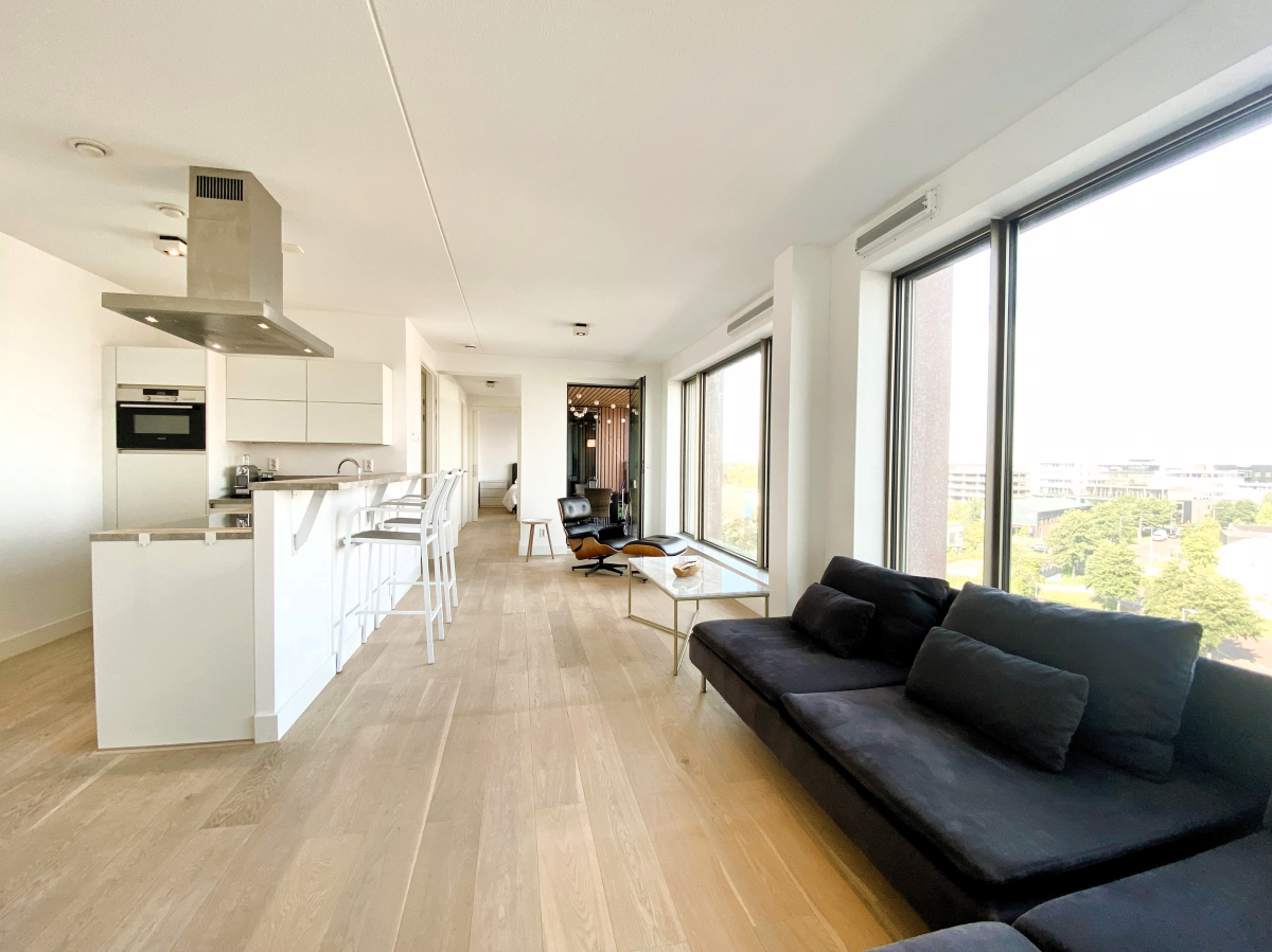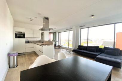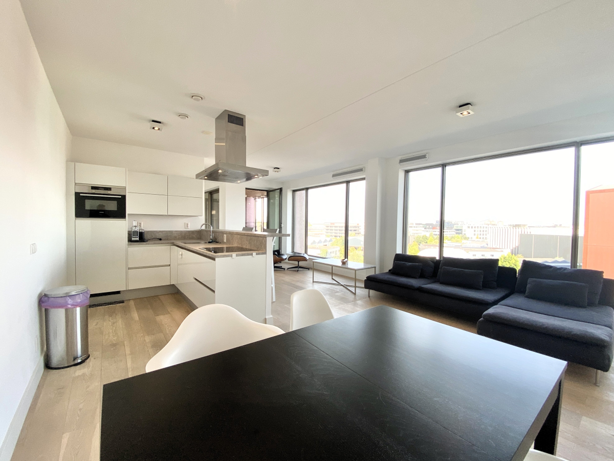 Layout: Central entrance with mailboxes, elevator, access to bicycle storage, and staircase. Apartment entrance on the 6th floor. Hallway leading to the spacious open-plan living and dining room, tastefully decorated, just like the rest of the apartment. The open-plan luxury kitchen is equipped with all the built-in appliances you could wish for. The living room offers stunning panoramic views. The spacious bedroom has ample closet space and is combined with a neat and sleekly tiled bathroom with a walk-in shower and sink. Sliding doors in the hallway or French doors in the living room provide access to the large balcony with stunning views over the IJ River and the city of Amsterdam. The apartment features high windows, underfloor heating, and ventilation, with adjustable room-by-room temperature control. The apartment also includes a spacious private storage unit and a shared bicycle shed in the basement of the complex.