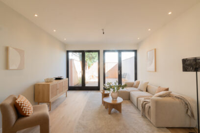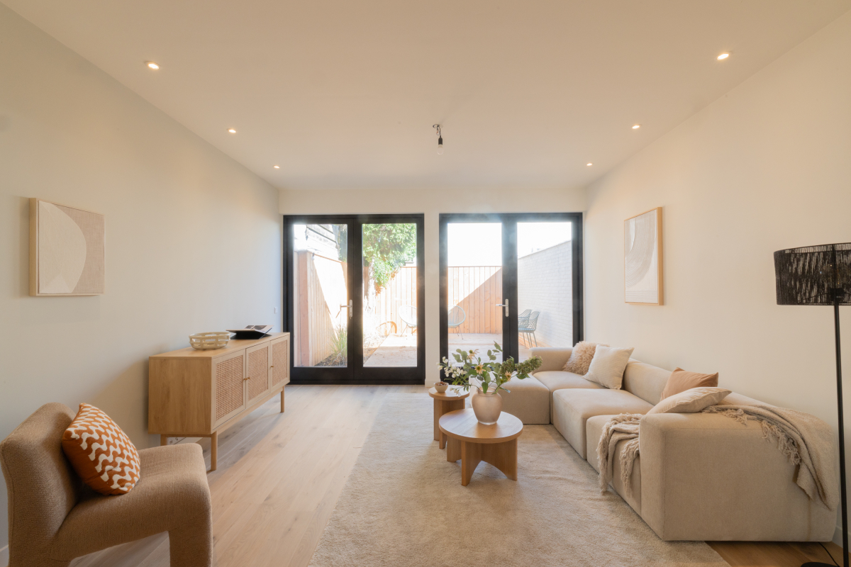 Ground floor: Entrance with separate toilet leading to the bright and modern kitchen/diner equipped with various built-in appliances, including a large oven, modern induction cooktop, fridge/freezer, and dishwasher. There is also a comfortable sofa right by the windows. Spacious living room with large double doors leading to the back garden, creating a beautiful blend of indoors and outdoors. The garden is low-maintenance and pleasantly private.