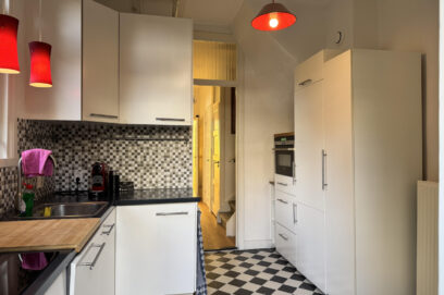 The front door leads to the hall, which provides access to the meter cupboard, the toilet, the living room, the staircase, and the kitchen. The living room overlooks Marnixlaan at the front, and a door at the rear leads to the spacious back garden. The separate kitchen is accessible from the hallway and is fully equipped, including a refrigerator, a freezer, a combination microwave oven, a dishwasher, a gas hob, and extractor fan. The bathroom is accessible from the kitchen and features a shower, vanity unit, and designer radiator. The back garden is also accessible from the kitchen, and there is a storage room in the back garden, which houses the central heating boiler and the washing machine.