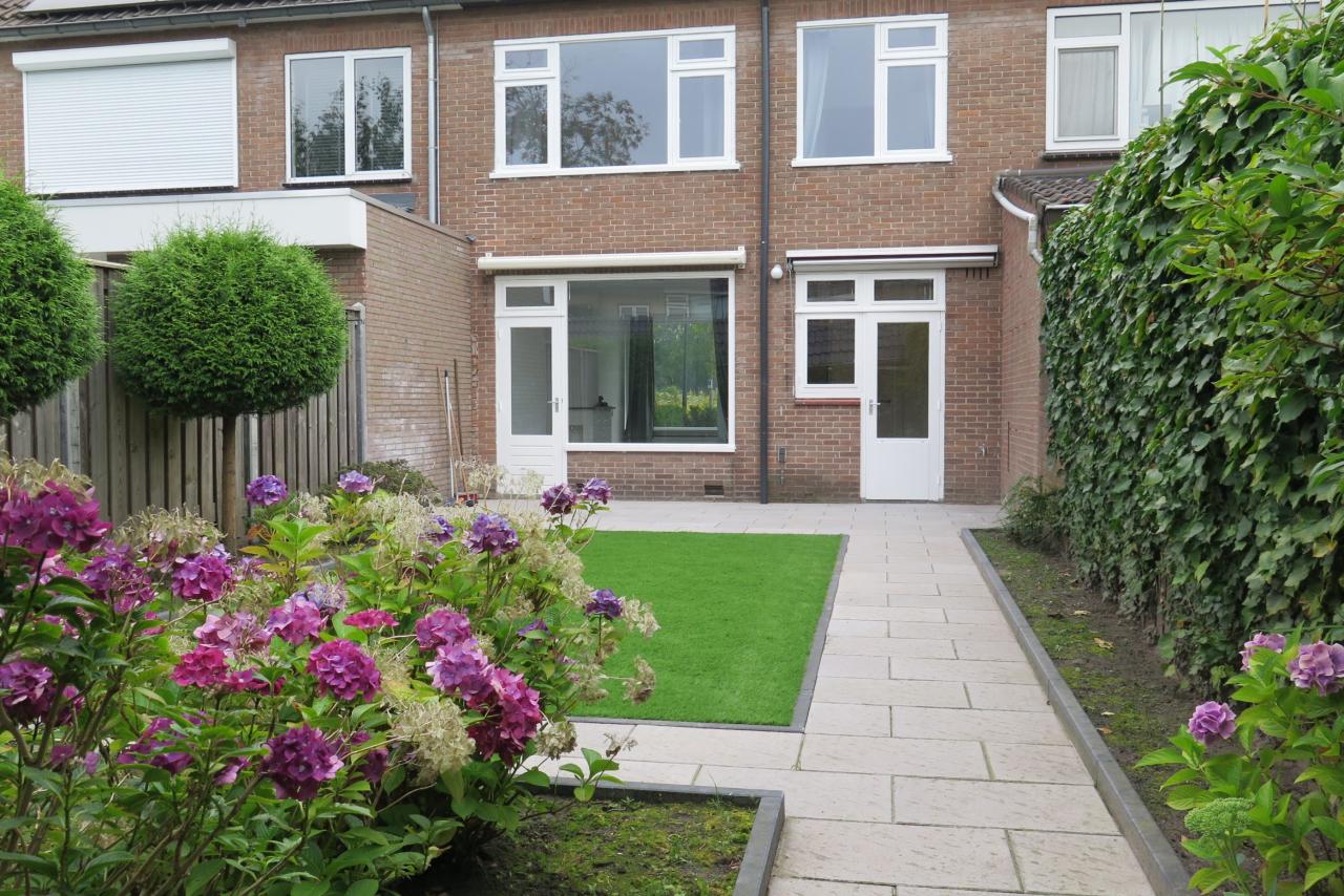 The backyard is located on the southwest and is beautifully landscaped with greenery, a terrace, walkway and a shed. The garden is sunny on the southwest and can also be reached via a back entrance.