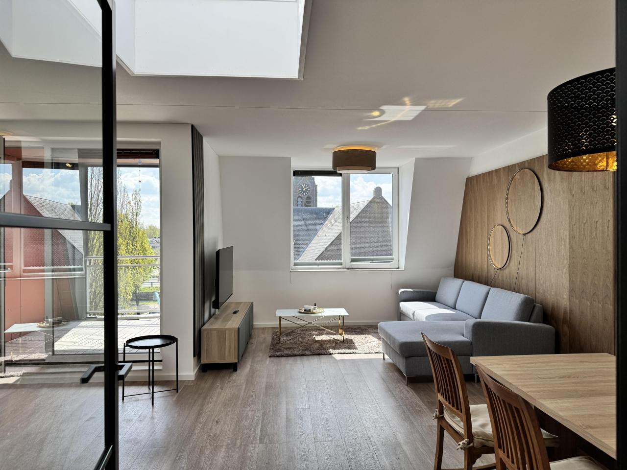 The bright and playfully designed living room features large windows, offering plenty of natural light and a pleasant view. From the living room, you have access to both the balcony and the open kitchen. The luxurious open kitchen is fully equipped with modern appliances, including a refrigerator, freezer, steam oven, dishwasher, induction hob, and extractor hood. The modern bathroom is fitted with a shower, toilet, double washbasin with vanity unit, and a design radiator.