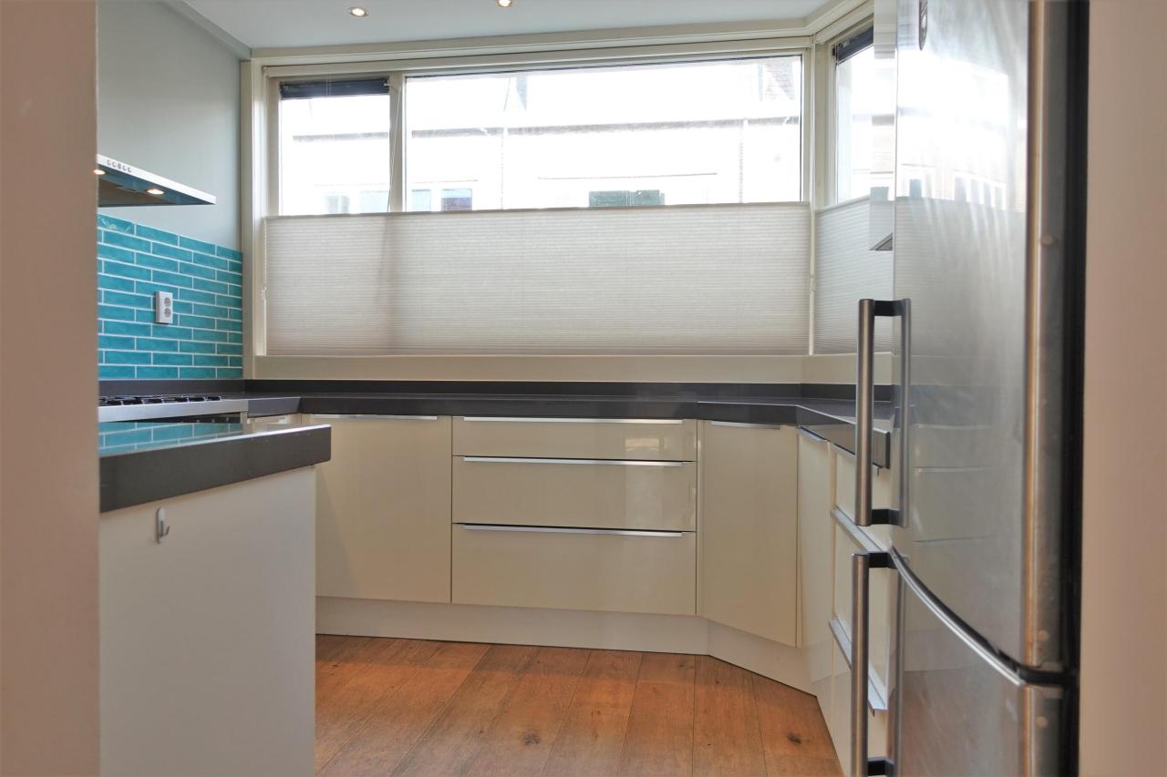 The toilet, the meter cupboard, the stairs to the first floor and the living room can be reached via the hallway. The living room is extra spacious due to an extension and provides access to a lovely south-west facing backyard. The modern luxury kitchen is located at the front of the property overlooking the street. This is equipped with all comforts, such as a refrigerator, a freezer, an oven, a gas hob and an extractor fan.