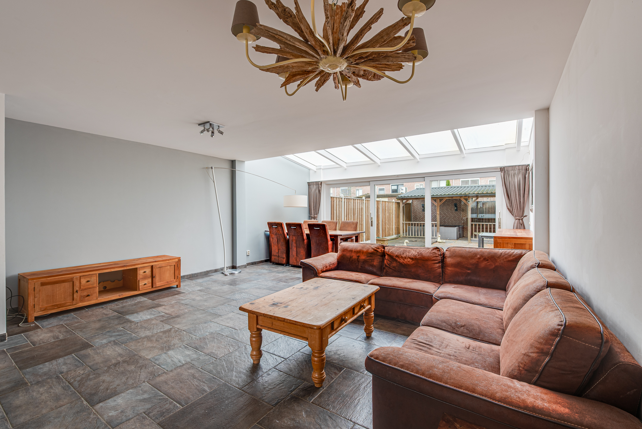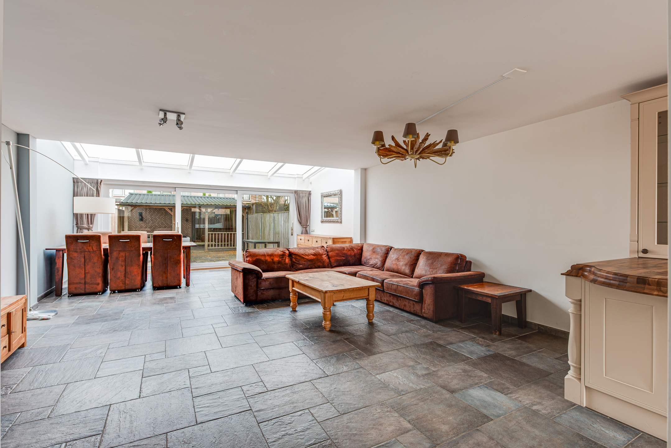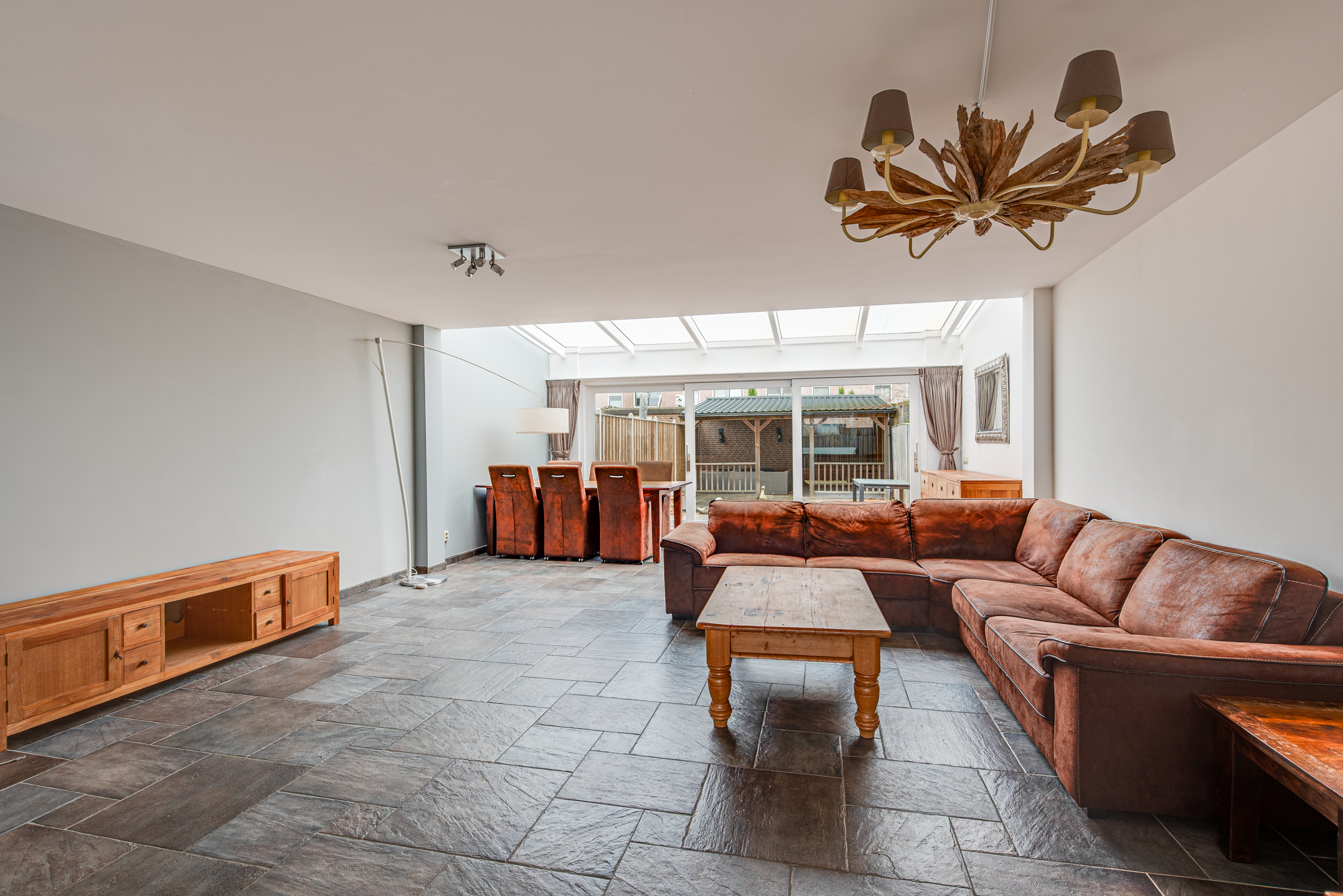 Ground floor: entrance hall with meter cupboard and toilet with washbasin. The living room provides access to the spacious northeast-facing rear garden. The open-plan kitchen is equipped with various built-in appliances. The living room has been extended at the rear, and the sunny back garden includes a covered terrace, a large storage shed, and convenient rear access.