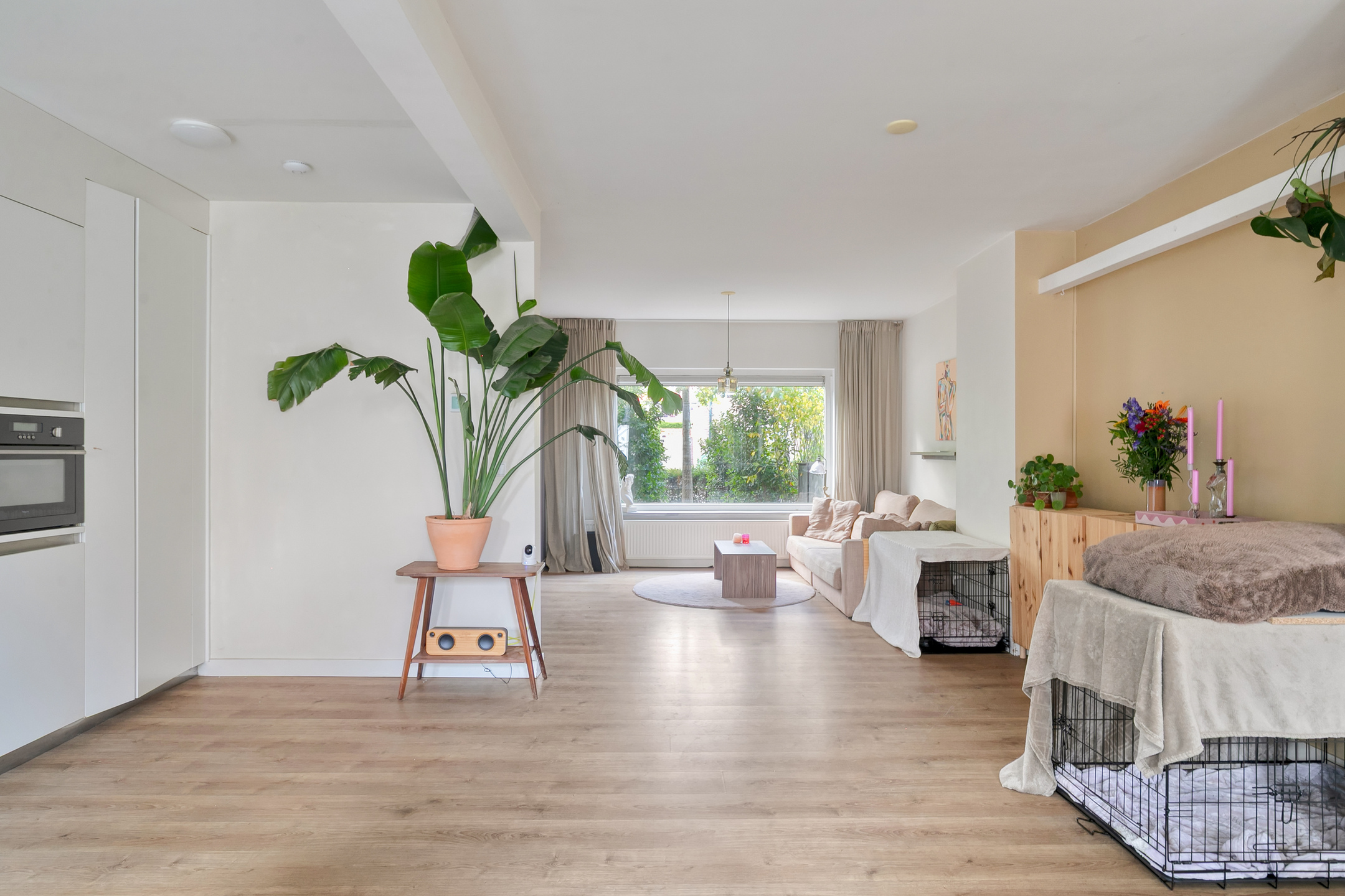 From the kitchen you have a pleasant view of the garden — a perfect spot to create a cosy dining area.