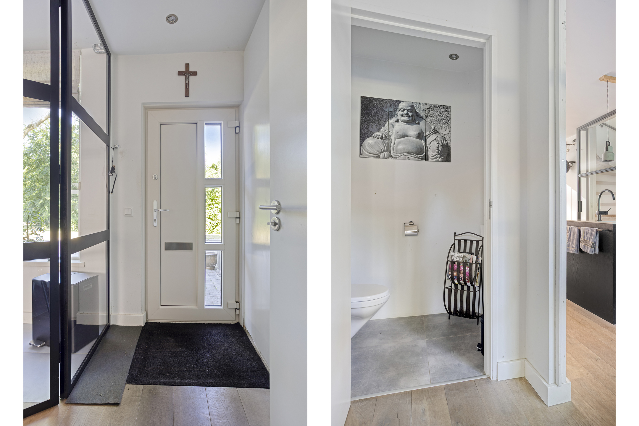 Bij aankomst valt direct de verzorgde uitstraling van de woning op. Aan de voorzijde grenzend aan een echte bosrijke groenstrook, met parkeerruimte op eigen terrein. Via de voordeur betreed je de lichte hal met toegang tot het moderne toilet, de trapopgang en de gezellige woonkamer. De woonkamer biedt veel lichtinval dankzij de grote raampartijen aan beide zijden. De open keuken bevindt zich aan de voorzijde van de woning en is voorzien van diverse inbouwapparatuur (Bosch) zoals een 5 zone kookplaat waaronder een wokbrander, volledig geïntegreerde vaatwasmachine, koelkast, oven en een ingebouwde rvs- afzuigschouw. Een echte eye catcher is de trapopgang; deze is voorzien van een mooie stalen deur in een voor deze ruimte ontworpen stalen frame, het sluit perfect aan bij stijl van de glazen wand tussen de keuken en de hal.