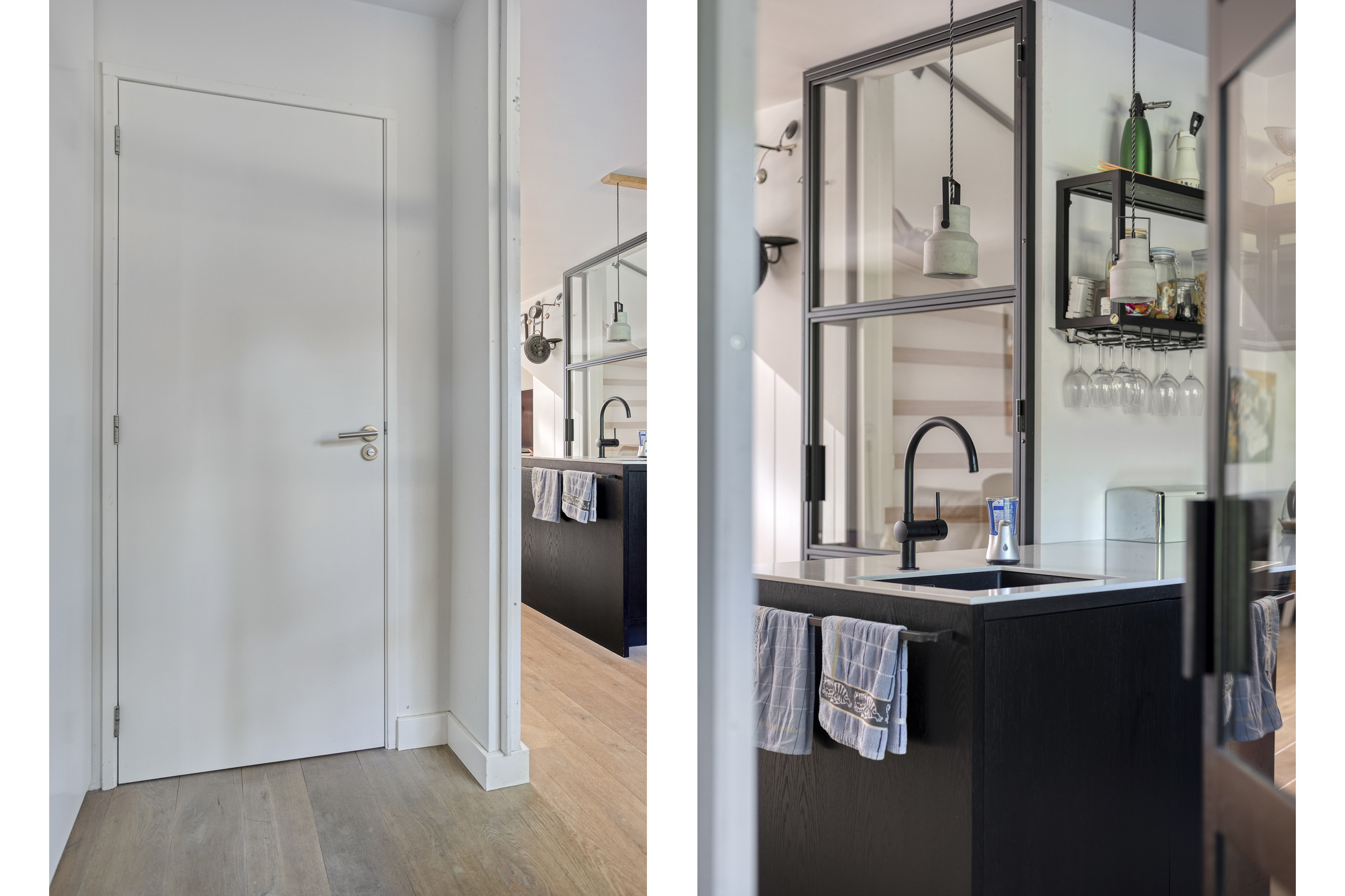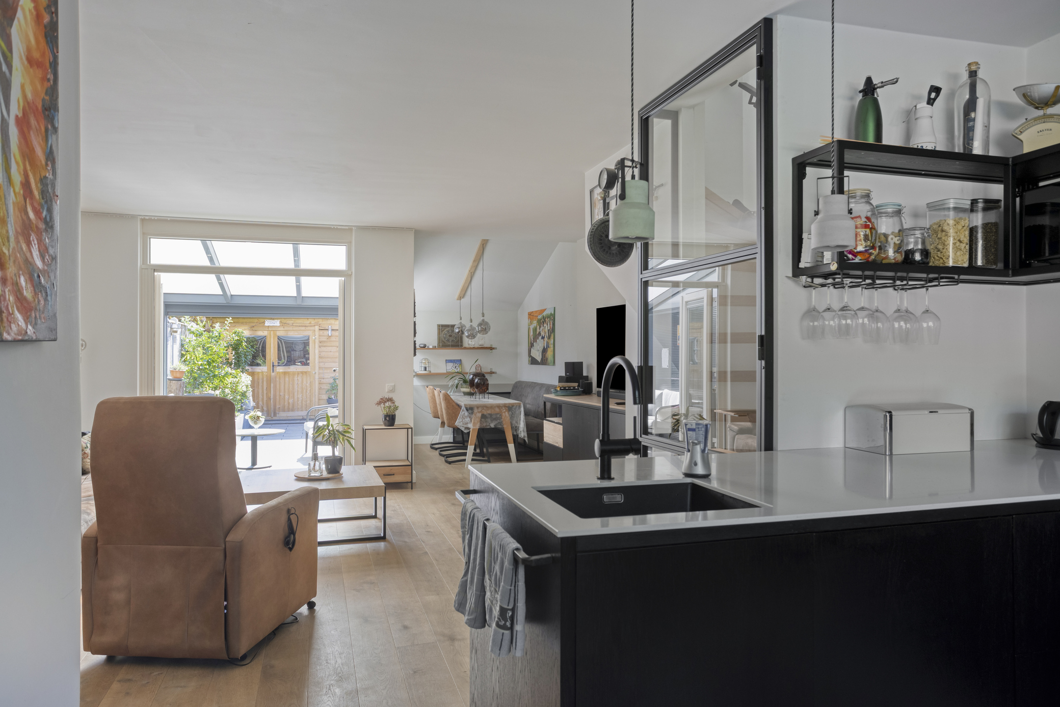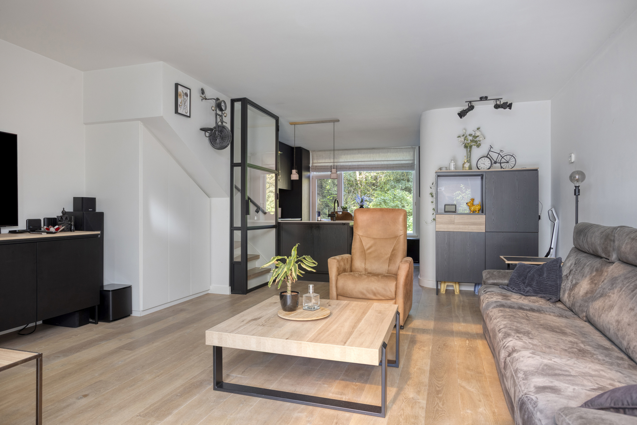 Upon arrival, the well-kept appearance of the house immediately stands out. At the front, it borders a real wooded green strip, with a parking space on its property. Through the front door, you enter the bright hall with access to the modern toilet, the staircase, and the cozy living room. The living room offers plenty of light thanks to the large windows on both sides. The open kitchen is located at the front of the house and is equipped with various built-in appliances (Bosch)such as a 5-burner hob (including one wok burner), fully integrated dishwasher, refrigerator, oven and a built-in stainless steel extractor hood. A real eye-catcher is the staircase; it is equipped with a beautiful steel door in a steel frame designed for this space, it fits perfectly with the style of the glass wall between the kitchen and the hall.