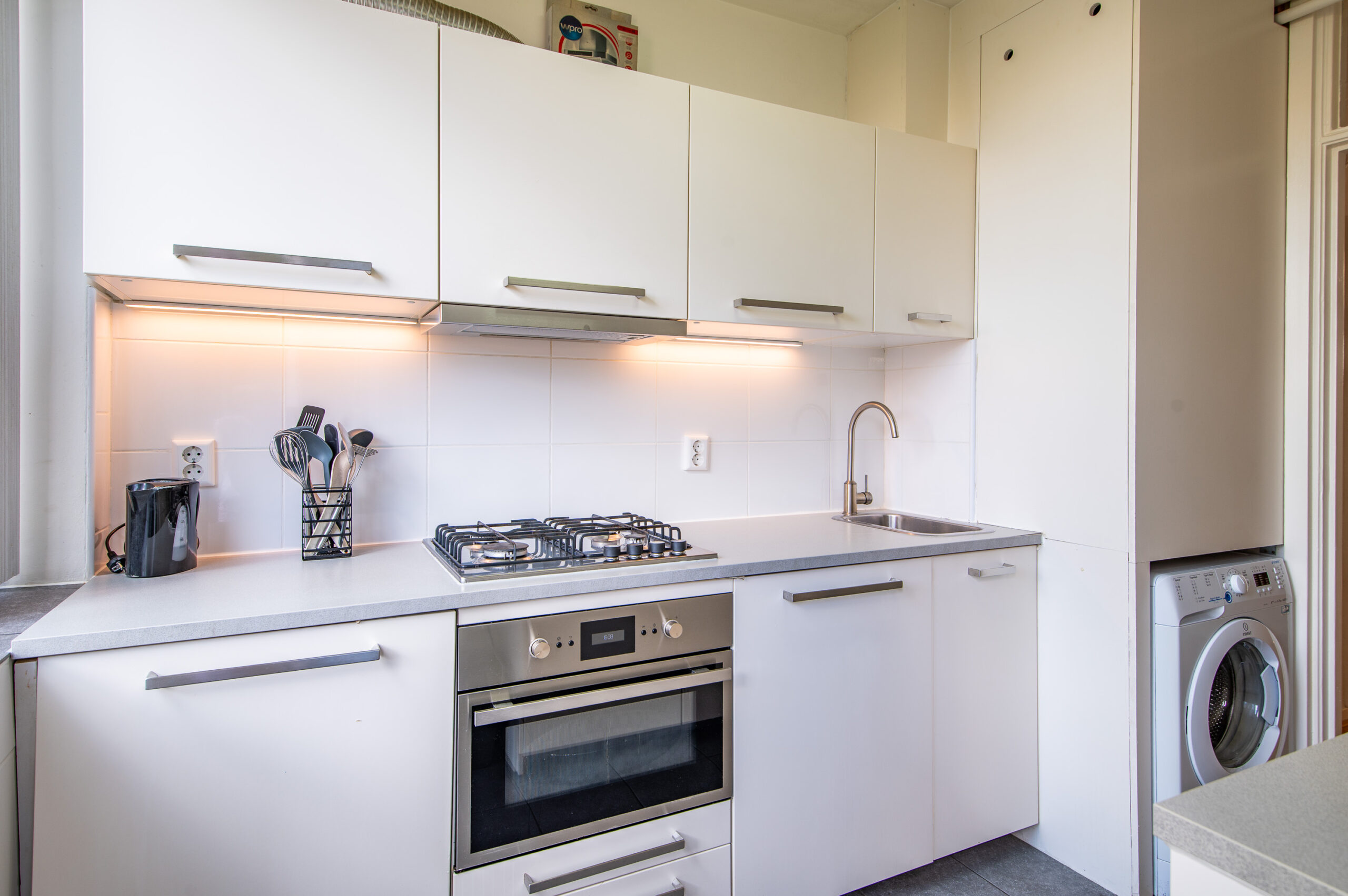 Tot slot de gesloten keuken met diverse inbouwapparatuur en een werkblad aan twee zijden. De keuken is onder andere voorzien van: vaatwasser, combi-magnetron, koelkast met vriesvak, gaskookplaat en afzuigkap. Zowel de wasmachine en de CV-ketel (2016) zijn keurig weggewerkt en vanuit de keuken is ook toegang tot het achtergelegen balkon.