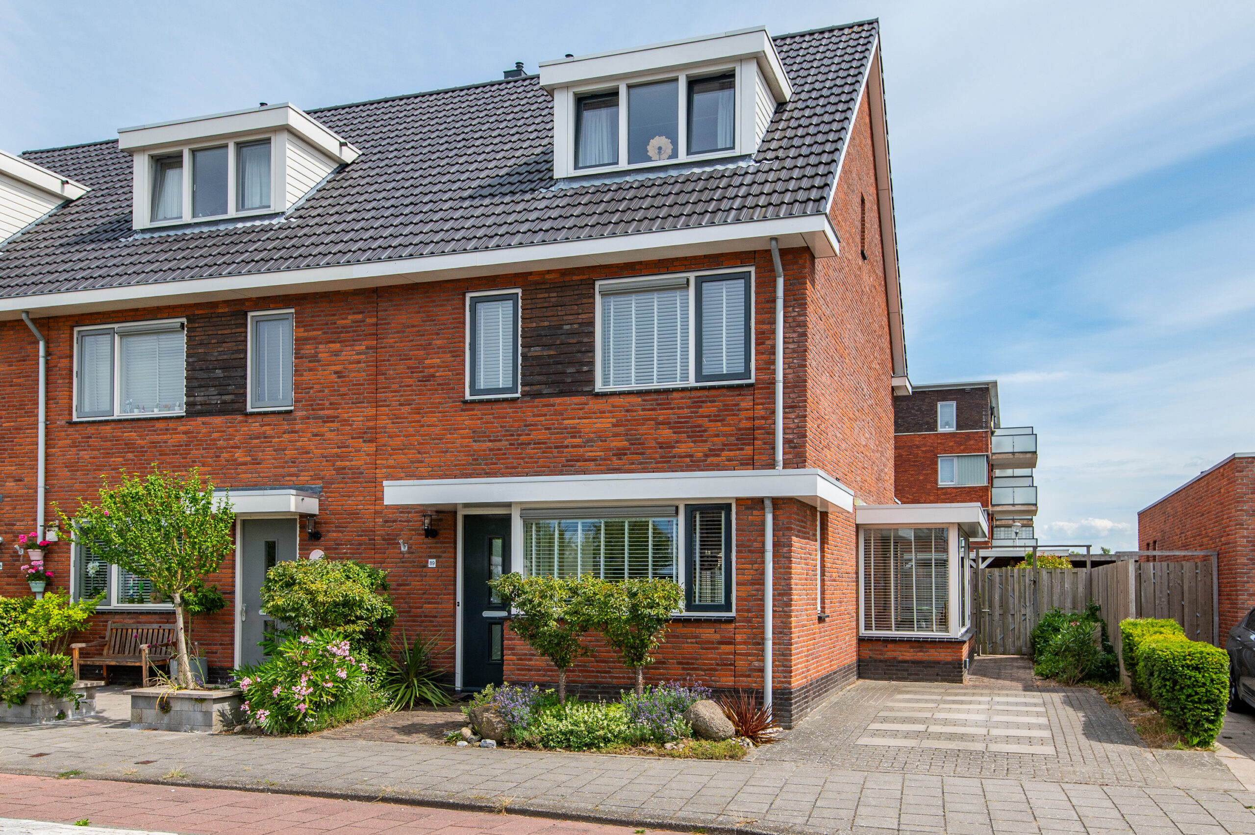 Front entrance via the front garden. Parking is available next to the house, and the street itself is a dead-end street for traffic.