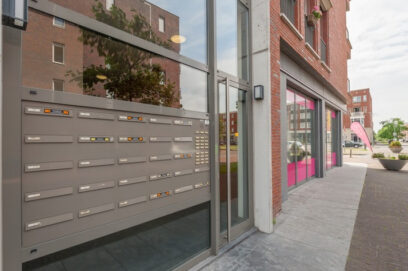Gezamenlijke entree van het appartementencomplex Fenicia met postbussen en een bellentableau. Vanuit deze centrale hal toegang tot de inpandige bergingen en de eigen parkeerplaats gelegen in de besloten binnenplaats.