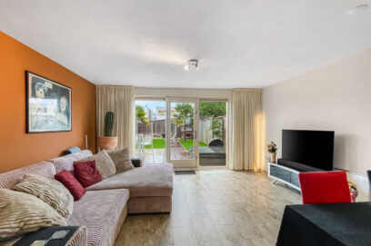 Je komt binnen in de hal met garderobe, modern toilet met fonteintje en de trap naar de eerste verdieping. De lichte woonkamer met open keuken heeft grote raampartijen tot de grond, waardoor de ruimte heerlijk licht is. In de woonkamer vind je een praktische trapkast en een deur naar de zonnige achtertuin.