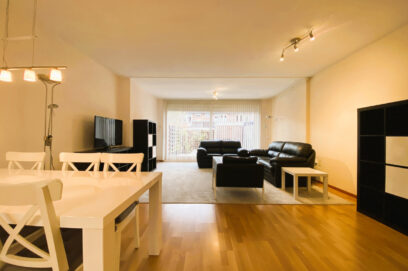 De woonkamer is gelegen aan de achterzijde van de woning met uitzicht op de tuin. De open keuken is praktisch ingericht en voorzien van een grote koelkast, vaatwasser, oven, gaskookplaat met afzuiger en ruime opbergmogelijkheden.