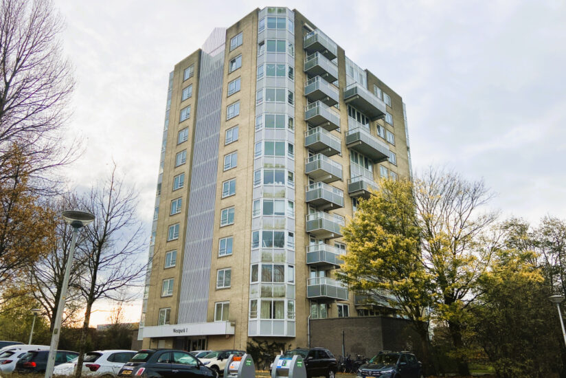Indeling: Centrale entree met video-intercom en liftinstallatie. Entree van het appartement op achtste verdieping. Hal met toegang tot alle vertrekken. Riante woonkamer met veel lichtinval door grote raampartijen en toegang tot het balkon. Open keuken voorzien van alle benodigde inbouwapparatuur, zoals een vaatwasser, combimagnetron, koelkast, vriezer, gaskookplaat met afzuiger en een volledige keukeninventaris. Riante ouderenslaapkamer voorzien van tweepersoonsbed en grote kast. De tweede slaapkamer is thans ingericht als studiekamer met slaapbank. De moderne badkamer is voorzien van een ligbad met douche en een wastafel. De wasmachine en droger zijn geplaatst in een aparte ruimte waar tevens de combiketel is geplaatst. Aparte toiletruimte met fonteintje. Het gehele appartement is voorzien van een mooie lichte laminaatvloer.