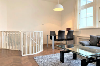 Indeling: Centrale entree met intercom en toegang tot het zeer fraaie atrium vanwaar je met de lift de tweede etage bereikt. Entree van het appartement met toegang tot de woonkamer met semi-open keuken, voorzien van alle benodigde inbouwapparatuur. Separate ruimte met wasmachine en droger en een separaat toilet met fonteintje. Op deze etage tevens een logeerkamer voorzien van een slaapbank. Deze kamer kan tevens prima dienen als werkkamer. Wenteltrap naar beneden waar de riante slaapkamer is gelegen, voorzien van tweepersoonsbed en veel kastruimte. Toegang tot de luxe badkamer voorzien van ligbad met douche, wastafel, tweede toilet en een designradiator. Vanuit de slaapkamer toegang tot een heerlijk balkon.
