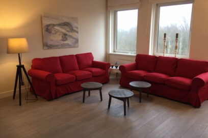 De royale woonkamer strekt zich uit van de voor- tot achterzijde van het gebouw. Grote ramen aan de achterzijde geven toegang tot het zuidelijk gelegen balkon met uitzicht op goed onderhouden groenvoorzieningen.