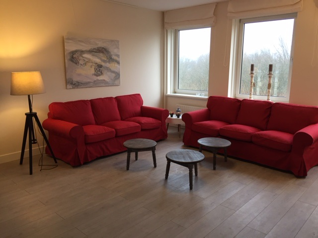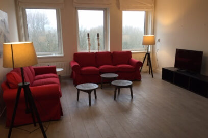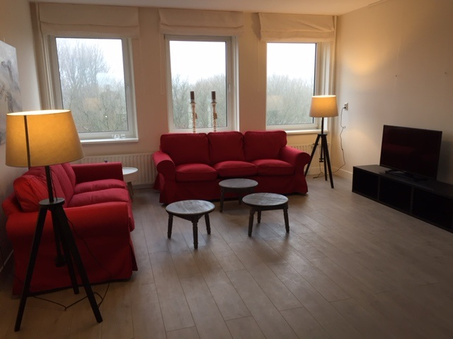 Het appartement is smaakvol ingericht met een combinatie van landelijke, moderne en klassieke elementen. De grote ramen zorgen voor veel daglicht en geven een ruimtelijk gevoel.