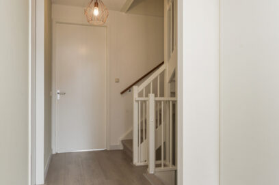 De trap naar de eerste verdieping is gestoffeerd en leidt naar een ruime overloop welke toegang geeft tot de eerste badkamer en 2 ruime slaapkamers. De ramen zijn allemaal voorzien van vaste horren. De badkamer op de eerste verdieping is voorzien van een wastafel, een douche, toilet en wasmachine aansluiting.