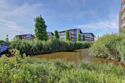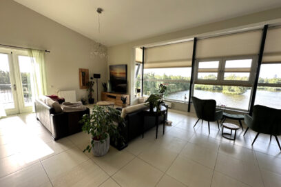 De enorme woonkamer met hoog plafond heeft door de grote raampartijen veel lichtinval en is voorzien van een open keuken met alle apparatuur. Vanuit de woonkamer toegang het ruime balkon. Vanaf hier heeft u uitzicht over het water en de groene omgeving. De ideale plek waar u tot in de avonduren van zon en uitzicht over het water en het groen kunt genieten. Aan de achterzijde nog 2 slaapkamers met beiden toegang tot het balkon.