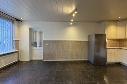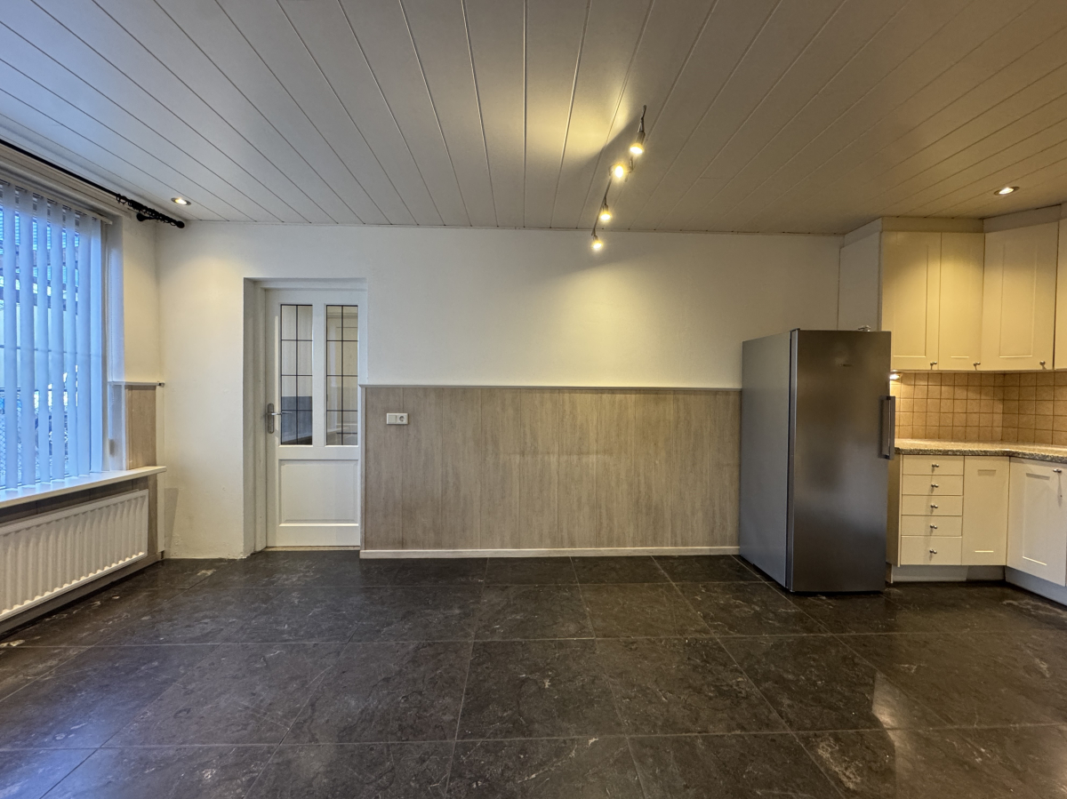 Woonkeuken met eenvoudige keukeninrichting waaronder een koelkast, elektrische kookplaat, een oven, een afzuigkap en een vaatwasser. Vanuit de woonkeuken bereik je een portaal met toegang tot de ruime woonkamer en een werk / studeerkamer.
