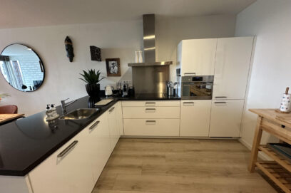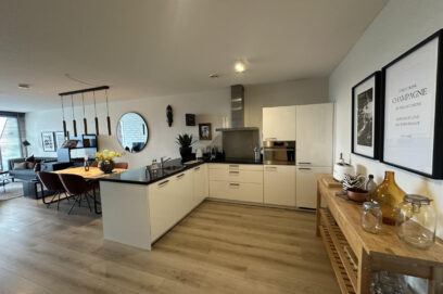 Royale woon/eetkamer van ca.11,0m x 4,20m met een open L-vormige keuken met ontbijtbar en voorzien van een inductiekookplaat, afzuigkap, koelkast, vriezer, combimagnetron en vaatwasser.