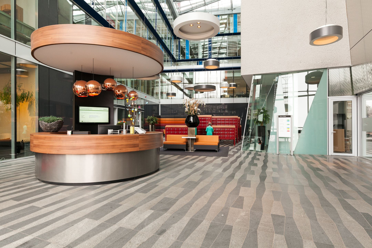Receptie en servicebalie, video bellenplateau, brievenbussen en toegang tot de liftinstallatie.