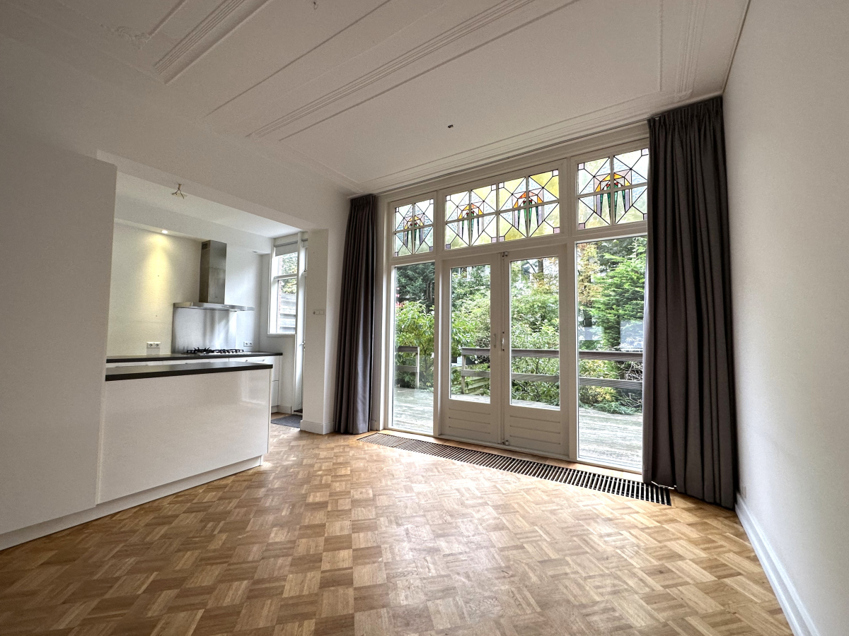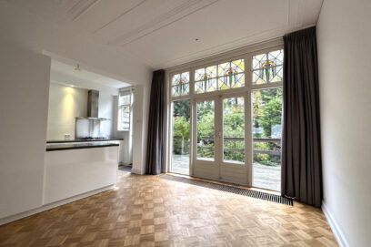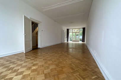 Zeer royale, brede en sfeervolle living ca. 13.30 x 3.85 met hoge originele sierplafonds, openslaande deuren naar veranda en de tuin.