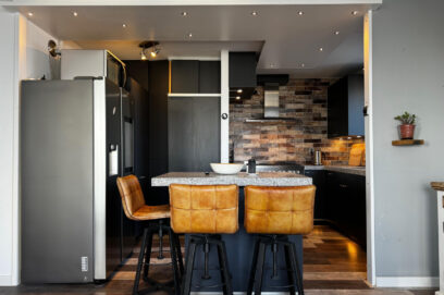Luxe open keuken met ontbijtbar. Fornuis met 6 pitten, afzuigkap en twee ovens, vaatwasser en dubbeldeurs koelkast met ijs en waterdispenser. Aparte kast voor de wasmachine en wasdroger.