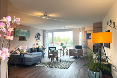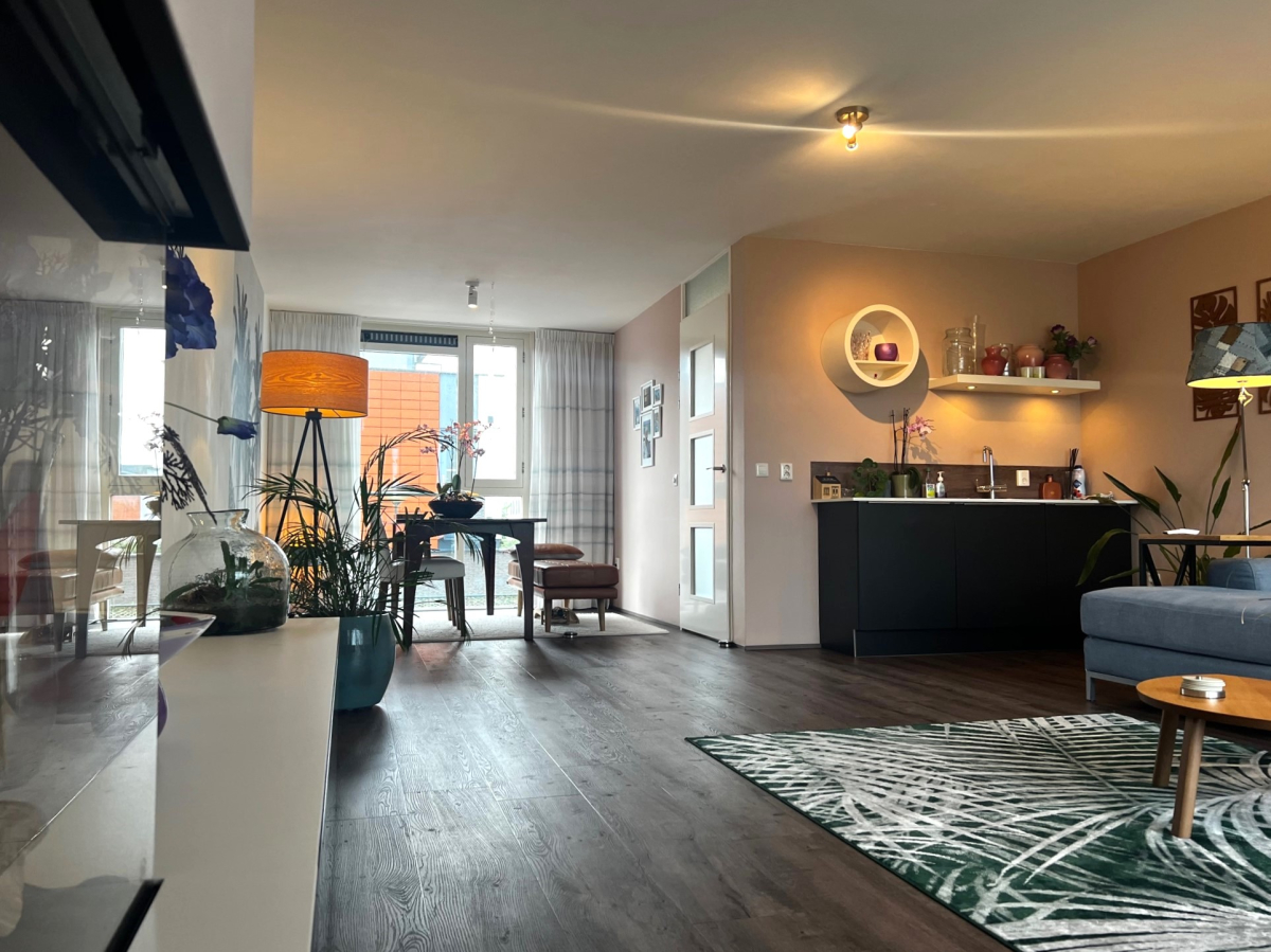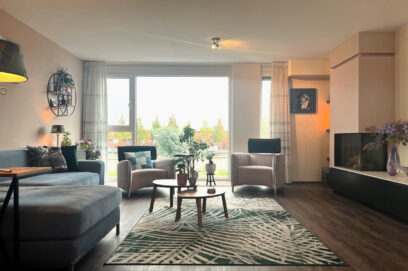 De gehele eerste verdieping is in gebruik als woonkamer. Ramen van vloer tot plafond zorgen hier voor een mooi uitzicht en fijne lichtinval. Er is voorzien in een fraaie gashaard en zelfs in een extra kitchenette met onder andere een kokend water kraan. Hoge kwaliteit meubels en inrichting zijn gebruikt, onder meer van Leolux, Samsung The Frame, etc.