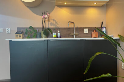 De luxe woonkeuken ligt aan de achterzijde van de begane grond en biedt toegang tot een enorm en zonnig terras aan het water met vrij uitzicht. De luxe (TKI) designkeuken is uiteraard voorzien van alle wenselijke inbouwapparatuur van onder andere Novy en Siemens. Het glazen werkblad en de hydraulische lades maken de keuken compleet.