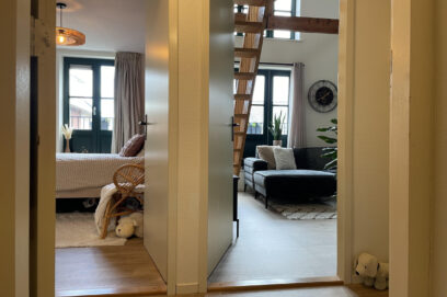 Toegang tot de zeer ruime woonkamer met prachtig hoog puntdak met openslaande deuren naar binnen. Losse trap naar zeer riante vide, welke perfect als werkplek en/of slaapgelegenheid kan fungeren. Semi open keuken, voorzien van inbouw koel-/vriescombinatie en gasstel met afzuiger.