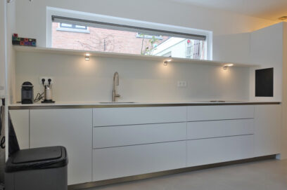 De lichte overloop biedt toegang tot de wc, meterkast, trap naar de tweede verdieping met bergruimte en toegang naar de ruime moderne eetkeuken. De luxe keuken is voorzien van: een koelkast, een vriezer, een inductie kookplaat, een afzuigkap die is verwerkt in de kookplaat, een vaatwasser en een Quooker. Vanuit de keuken is een bijkeuken te bereiken deze is in het verlengde gelegen van de moderne keuken, in de zelfde stijl afgewerkt en voorzien van voorraad kasten en de wasmachine. Tussen de woonkamer en de keuken staat een royale tafel met zicht naar buiten. De lichte woonkamer bevindt zich aan de andere kant van de maisonnette en biedt toegang tot het balkon en het ruime dakterras. De woonkamer, keuken en overloop zijn voorzien van een strakke giet vloer.
