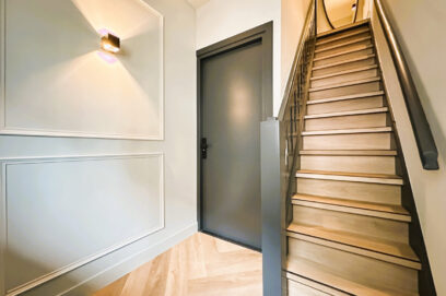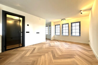 Indeling: Centrale entree op de begane grond met trap naar de eerste etage. Separaat toilet met fonteintje. Grote woonkamer met open keuken aan de voorzijde. De luxe keuken is voorzien van een koel-/vriescombinatie, een combi-oven, vaatwasser en een inductiekookplaat met afzuigkap. Aparte kast met wasmachine en droger. Aan de achterzijde bevindt zich de grote slaapkamer met toegang tot de luxe badkamer met inloopdouche, dubbel wastafelmeubel en een designradiator. De slaapkamer biedt tevens toegang tot het riante balkon aan de achterzijde. Het gehele appartement is voorzien van mooie raambekleding, vaste verlichting en een fraaie visgraatvloer met vloerverwarming.