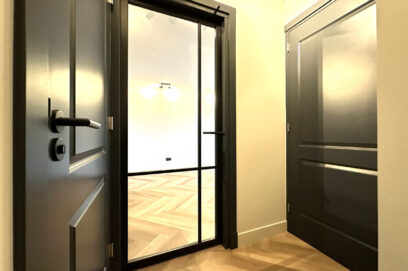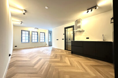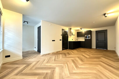 Indeling: Centrale entree op de begane grond met trap naar de eerste etage. Separaat toilet met fonteintje. Grote woonkamer met open keuken aan de voorzijde. De luxe keuken is voorzien van een koel-/vriescombinatie, een combi-oven, vaatwasser en een inductiekookplaat met afzuigkap. Aparte kast met wasmachine en droger. Aan de achterzijde bevindt zich de grote slaapkamer met toegang tot de luxe badkamer met inloopdouche, dubbel wastafelmeubel en een designradiator. De slaapkamer biedt tevens toegang tot nog te realiseren zonneterras. Het gehele appartement is voorzien van mooie raambekleding, vaste verlichting en een fraaie visgraatvloer met vloerverwarming.
