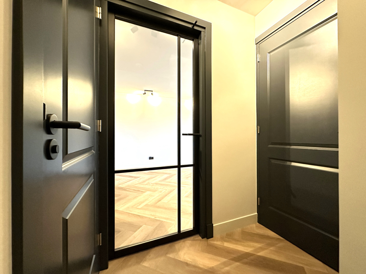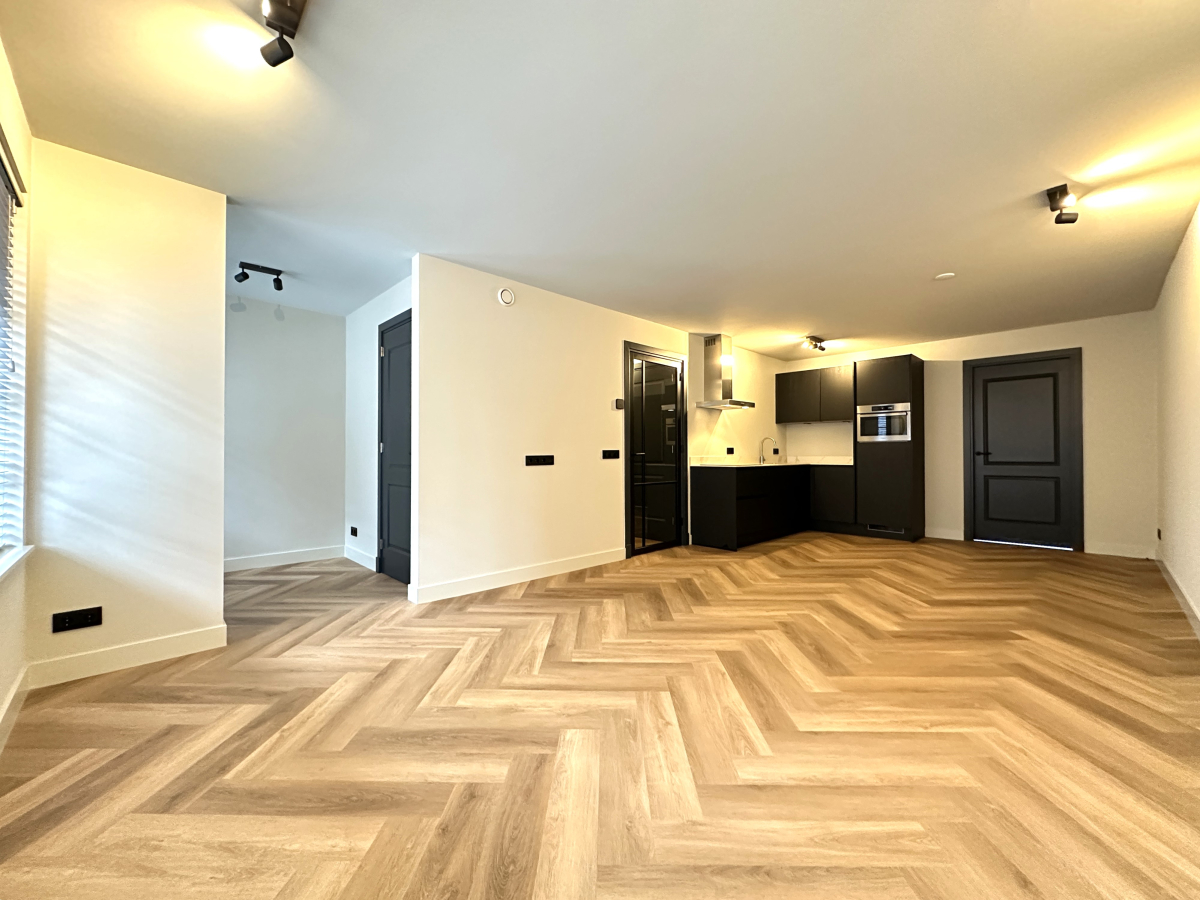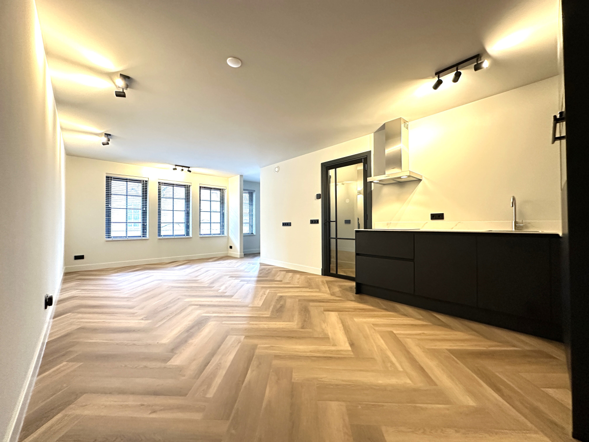 Indeling: Centrale entree op de begane grond met trap naar de eerste etage. Separaat toilet met fonteintje. Grote woonkamer met open keuken aan de voorzijde. De luxe keuken is voorzien van een koel-/vriescombinatie, een combi-oven, vaatwasser en een inductiekookplaat met afzuigkap. Aparte kast met wasmachine en droger. Aan de achterzijde bevindt zich de grote slaapkamer met toegang tot de luxe badkamer met inloopdouche, dubbel wastafelmeubel en een designradiator. De slaapkamer biedt tevens toegang tot nog te realiseren zonneterras. Het gehele appartement is voorzien van mooie raambekleding, vaste verlichting en een fraaie visgraatvloer met vloerverwarming.