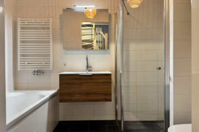 De overloop biedt toegang tot de drie slaapkamers en de badkamer. De badkamer is voorzien van een bad, een douche, een wc, een wastafel met meubel en een design radiator.