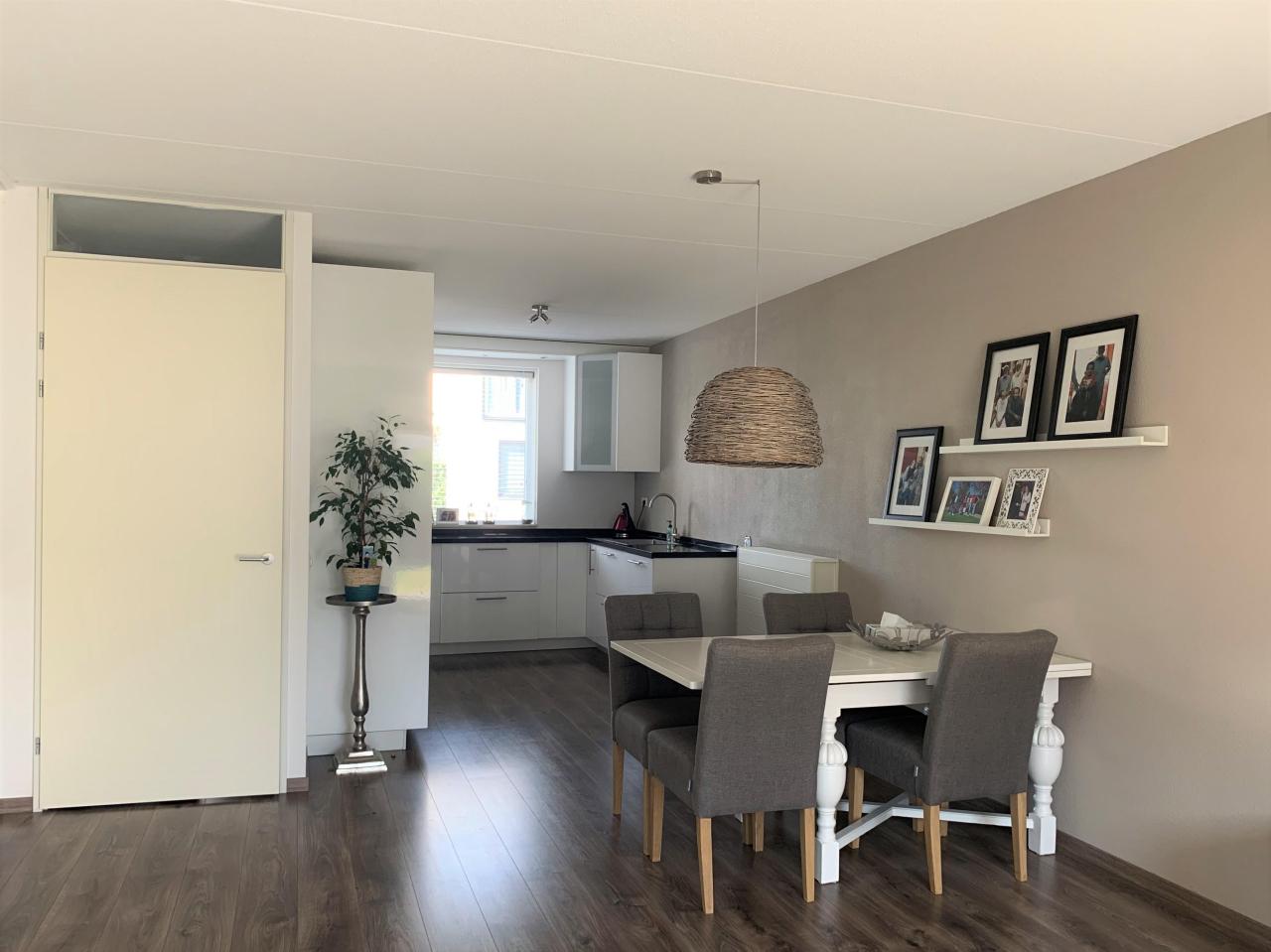 Begane grond: entree hal met trapopgang, vrij hangend toilet en toegang tot de woonkamer. De ruimte woonkamer met open keuken woonkamer beschikt over een loopdeur naar de royale achtertuin. De open keuken aan de voorzijde van de woning is voorzien van een keramische kookplaat, afzuigkap, oven, magnetron en koel- vriescombinatie.