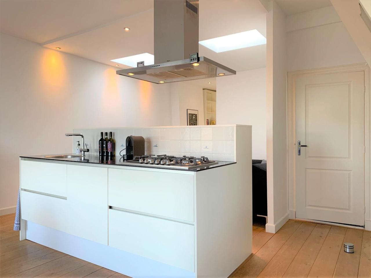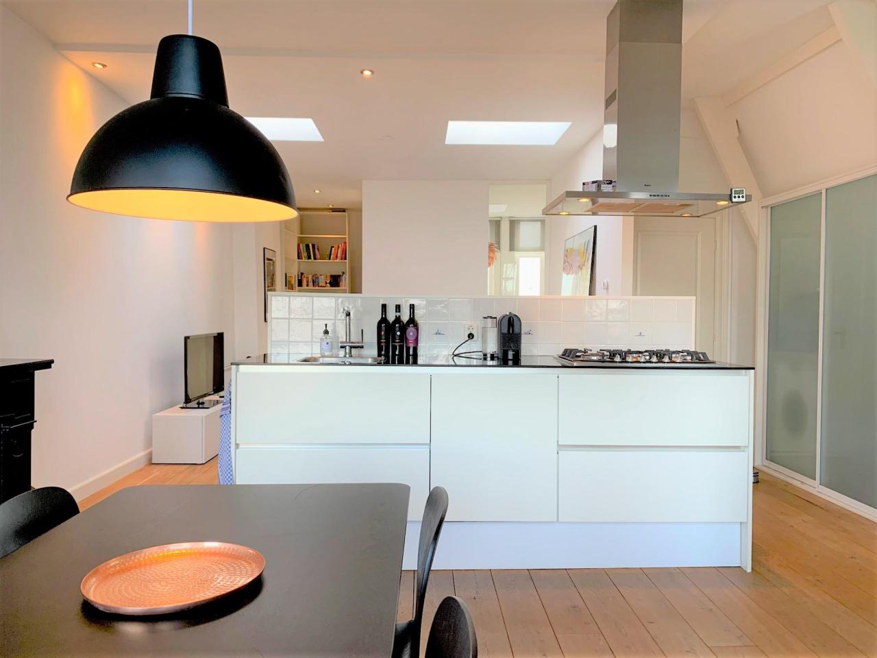 Indeling: Gezamenlijke entree van de woning met trap naar de vierde etage. Zeer ruime woon-/eetkamer en open keuken. De keuken is voorzien van combi-oven, vaatwasser, koelkast, vriezer en gasfornuis met afzuigkap. Ruime slaapkamer aan de voorzijde met tweepersoonsbed en veel kastruimte. De badkamer is voorzien van een ligbad, een aparte douche en een wastafel. Aparte kast waar de wasmachine zich bevindt. Separate toiletruimte. Het gehele appartement is voorzien van een fraaie houten vloer.