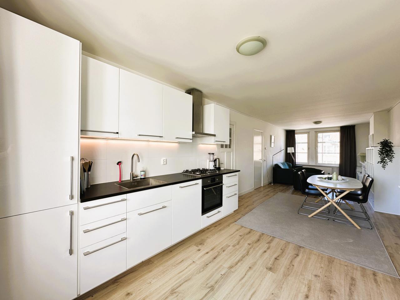 Indeling: Centrale entree met trap naar de derde verdieping waar zich de entree van het appartement bevindt. Hal met toegang tot alle vertrekken. Lichte woonkamer met open keuken die toegang geeft tot het zonnige balkon aan de achterzijde van de woning, dan over de volledige breedte van het appartement strekt. De open keuken is voorzien van een koelkast, vriezer, vaatwasser, grote oven, gasfornuis, afzuiging en volledige keukeninventaris. De ruime master bedroom is voorzien van een tweepersoonsbed en garderobekast. Tweede ruime slaapkamer en hier bevindt in een aparte kast de wasmachine en droger. De badkamer is voorzien van een douchecabine, wastafelmeubel, toilet en designradiator.