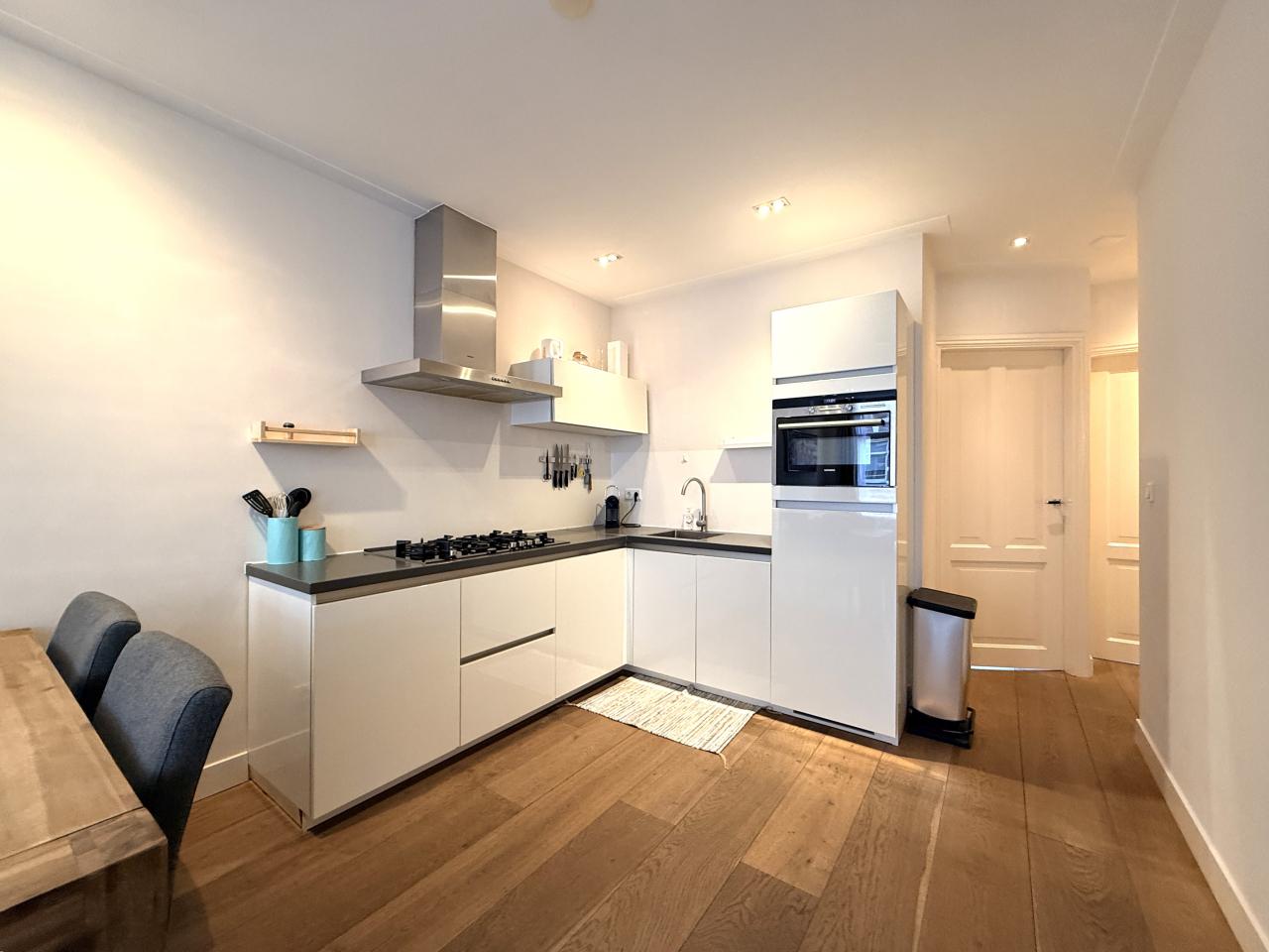 Indeling: centrale entree met trap naar de 1e etage. Entree van het appartement in de lichte woonkamer en moderne open keuken voorzien van koelkast, vriezer, vaatwasser, 5 pits gasfornuis met afzuigkap en volledige keukeninventaris. Aan de achterzijde van de woning bevinden zich de 2 slaapkamers. De master bedroom is uitgerust met een tweepersoonsbed en grote kastenwand. De andere, kleinere slaapkamer geeft toegang tot het zeer ruime balkon met zitgelegenheid. De badkamer is voorzien van een douche, wastafelmeubel een designradiator. Het toilet met fonteintje is apart.