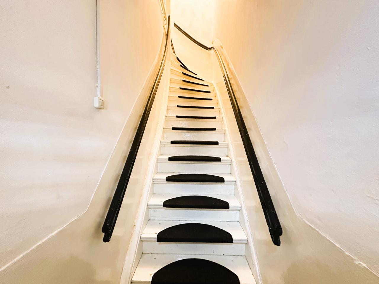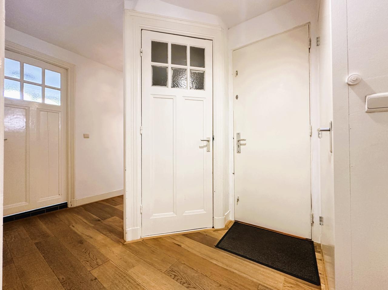 Privé entree op de begane grond met trap naar de eerste verdieping. Vanuit de hal zijn alle vertrekken van het appartement bereikbaar.