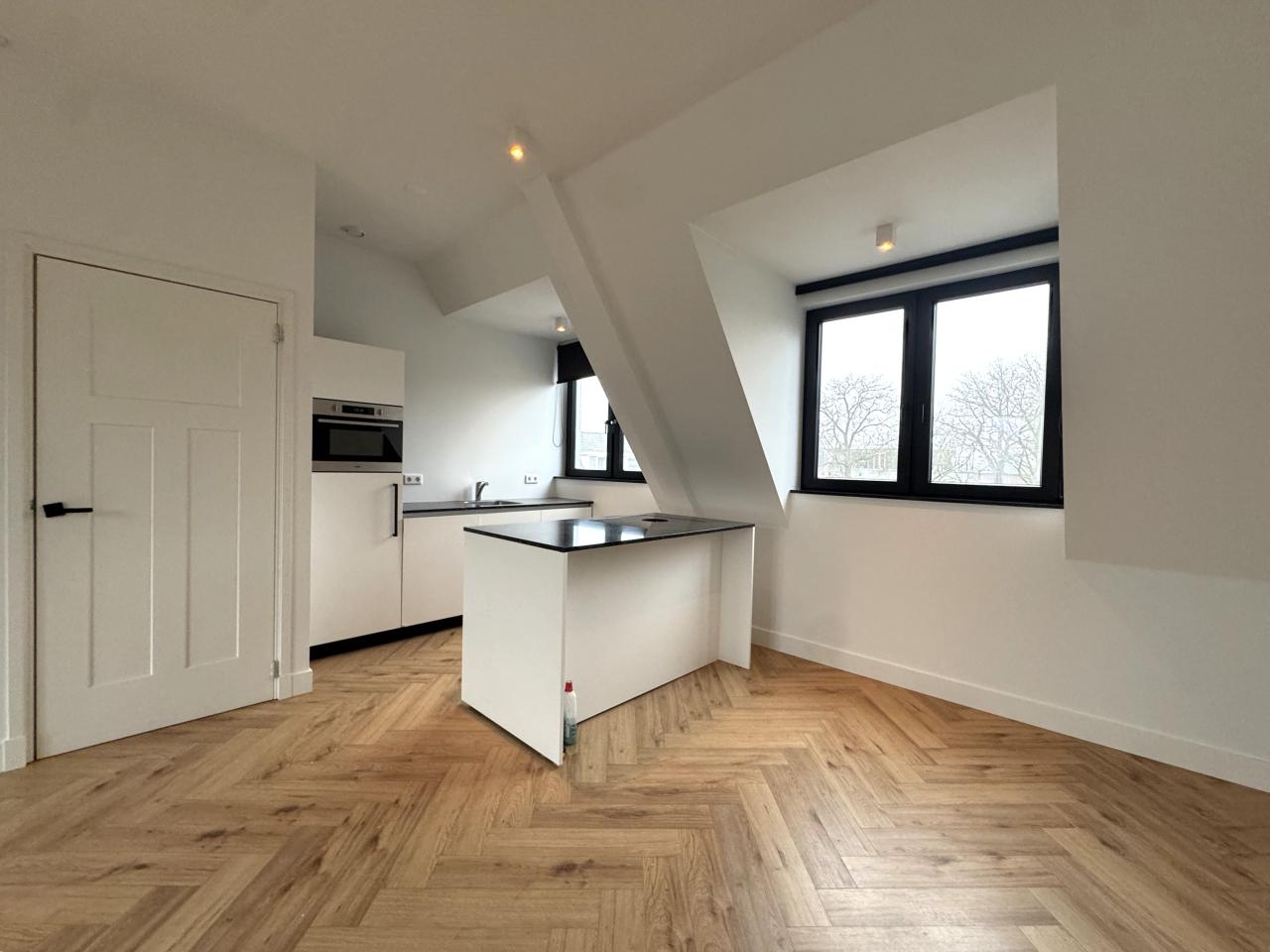 De woonkamer met open keuken en openslaande deuren naar het dakterras. De moderne keuken is compleet uitgevoerd met diverse inbouwapparatuur, waaronder een vaatwasser, oven, kookplaat, afzuigkap, koelkast en vrieskast.