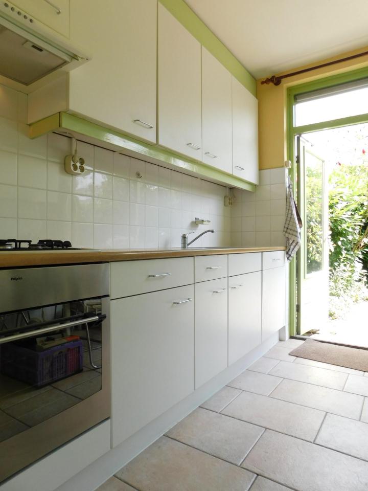 De keuken beschikt over diverse onder- en bovenkasten, oven, 4-pits gasfornuis, inbouwvaatwasser en wasbak met mengkraan. Ook is via de keuken middels een loopdeur de achtertuin te bereiken.