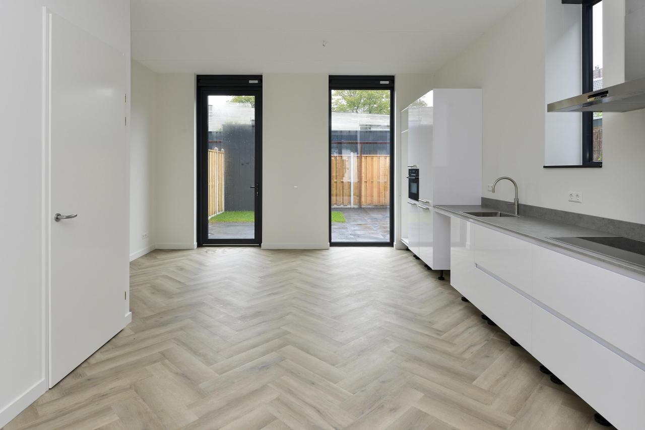 De royale woonkamer met open keuken is bijzonder licht door de grote raampartijen aan de voor- en achterzijde van de woning. Vanuit de woonkamer toegang tot de aangelegde achtertuin met houten berging en toegang via de zijtuin.