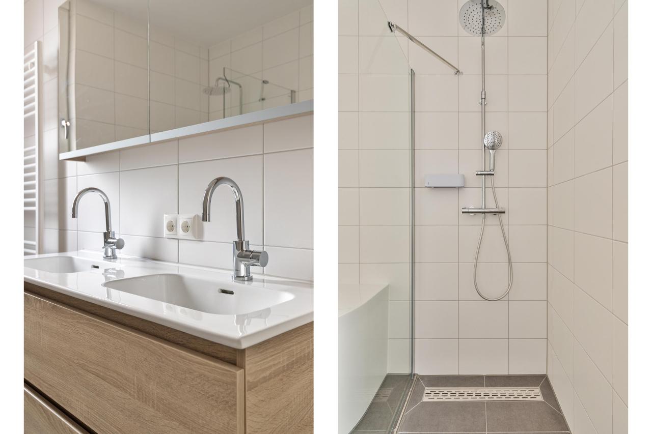 De badkamer ligt helemaal voor in de gang. Deze is compleet uitgevoerd met een aparte inloop douche, een ligbad, dubbele wastafel met meubel en spiegel.