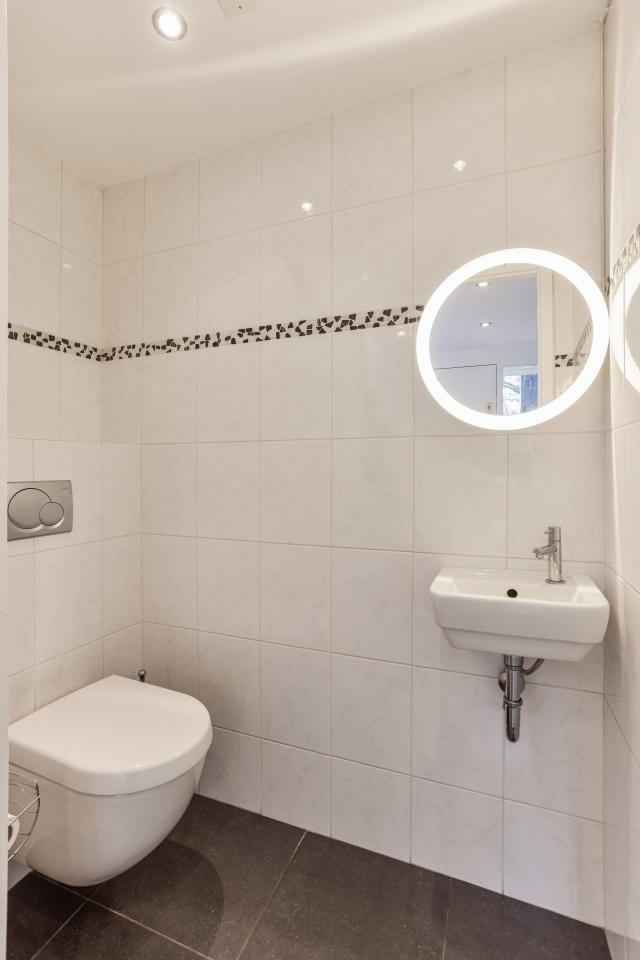 De tweede badkamer bevindt zicht eveneens op de 1e verdieping en hier vinden we een bad, douche, design radiator, dubbele wastafel met meubel en verlichting en het tweede toilet.