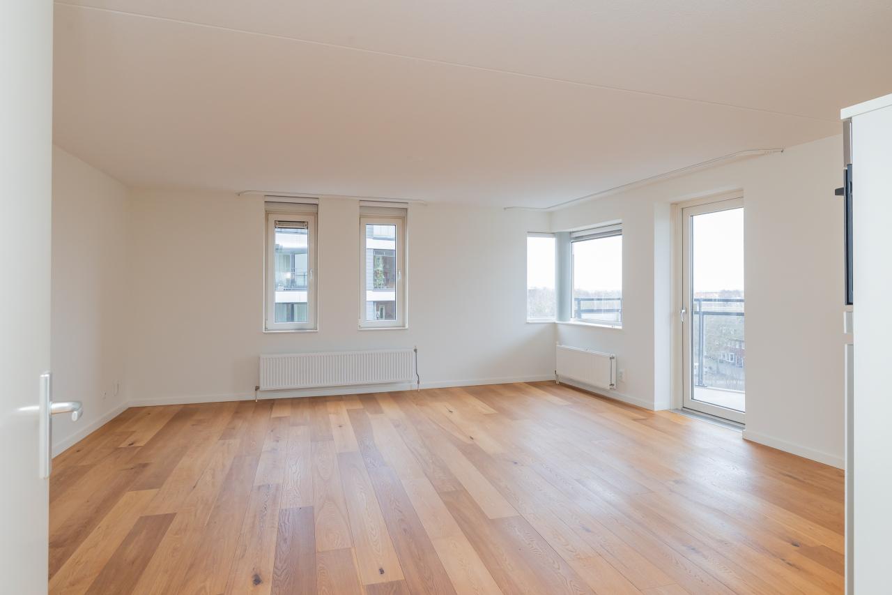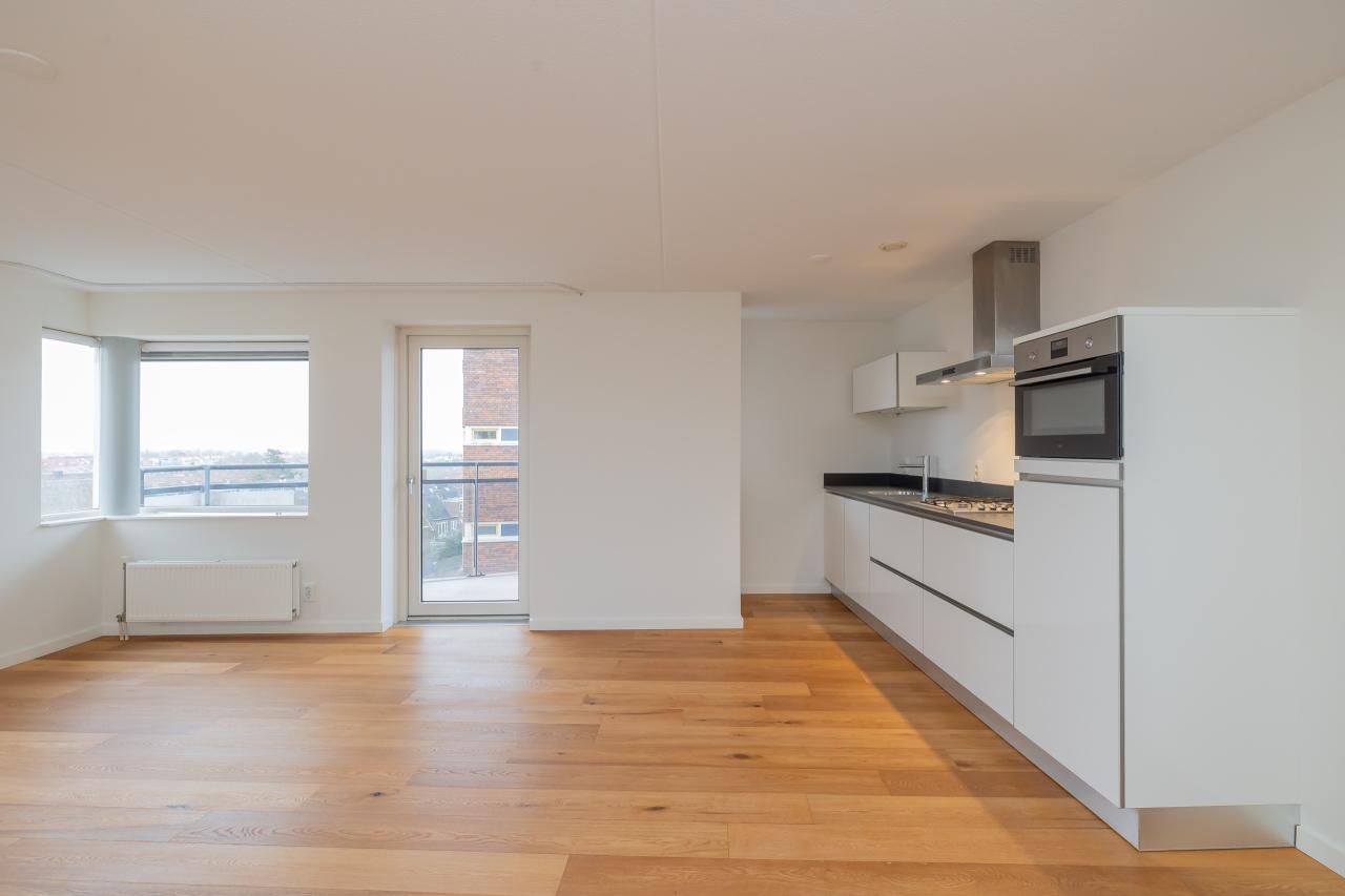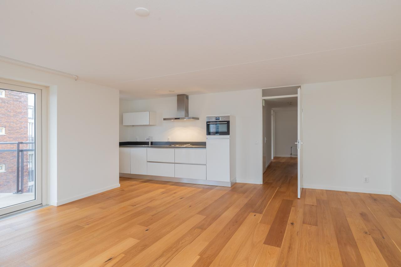 Het appartement zelf is gelegen op de vijfde verdieping aan een galerij die slechts door drie appartementen wordt gedeeld. Dankzij de gunstige ligging op het zuidwesten fungeert deze galerij als een heerlijke plek om buiten in de zon te zitten. De entree van de woning leidt naar een centrale L-vormige gang die toegang biedt tot alle vertrekken. De lichte woonkamer valt direct op door de grote raampartijen die zorgen voor een schitterend uitzicht over de omgeving. De moderne open keuken is naadloos in de ruimte geïntegreerd en van alle gemakken voorzien, waaronder een vaatwasser, combi-oven, koelkast met vriezer en een gaskookplaat met afzuigkap.