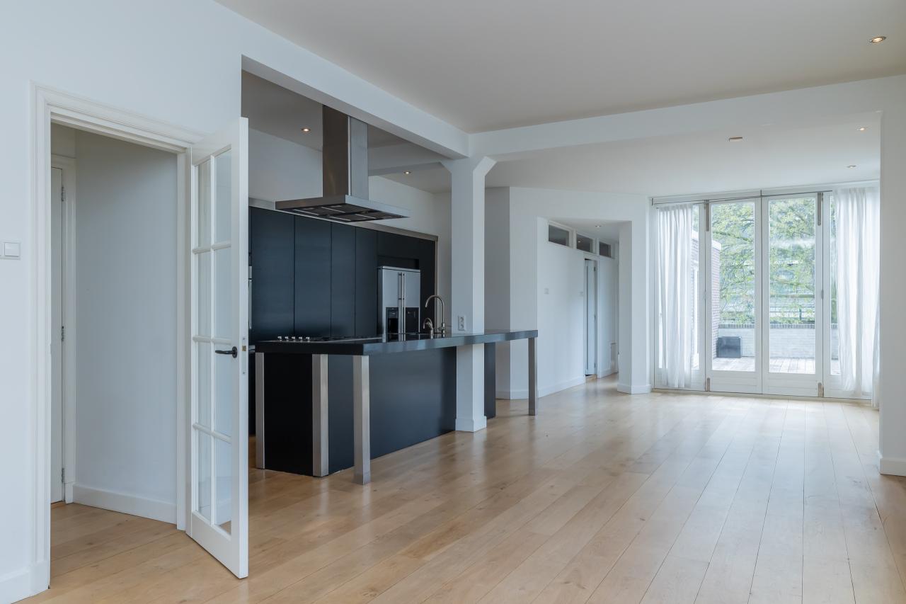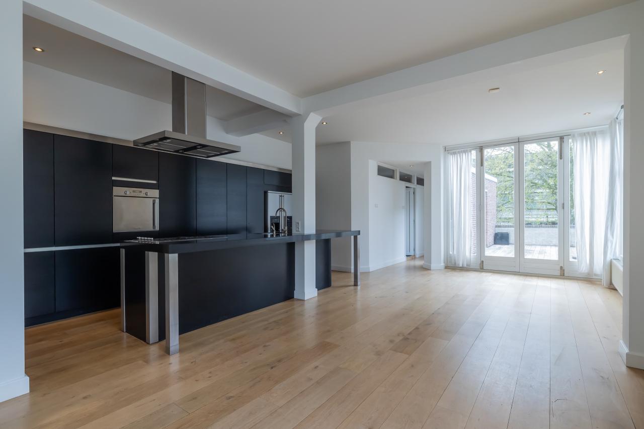 De woning op de eerste verdieping kenmerkt zich door een royale lichtinval dankzij de vele raampartijen en de authentieke glas-in-looddetails. De woonkamer vormt het hart van het appartement en beschikt over een groot kookeiland met een strakke afwerking en een moderne Amerikaanse koel-vriescombinatie. Het gehele appartement is voorzien van een nette laminaatvloer.