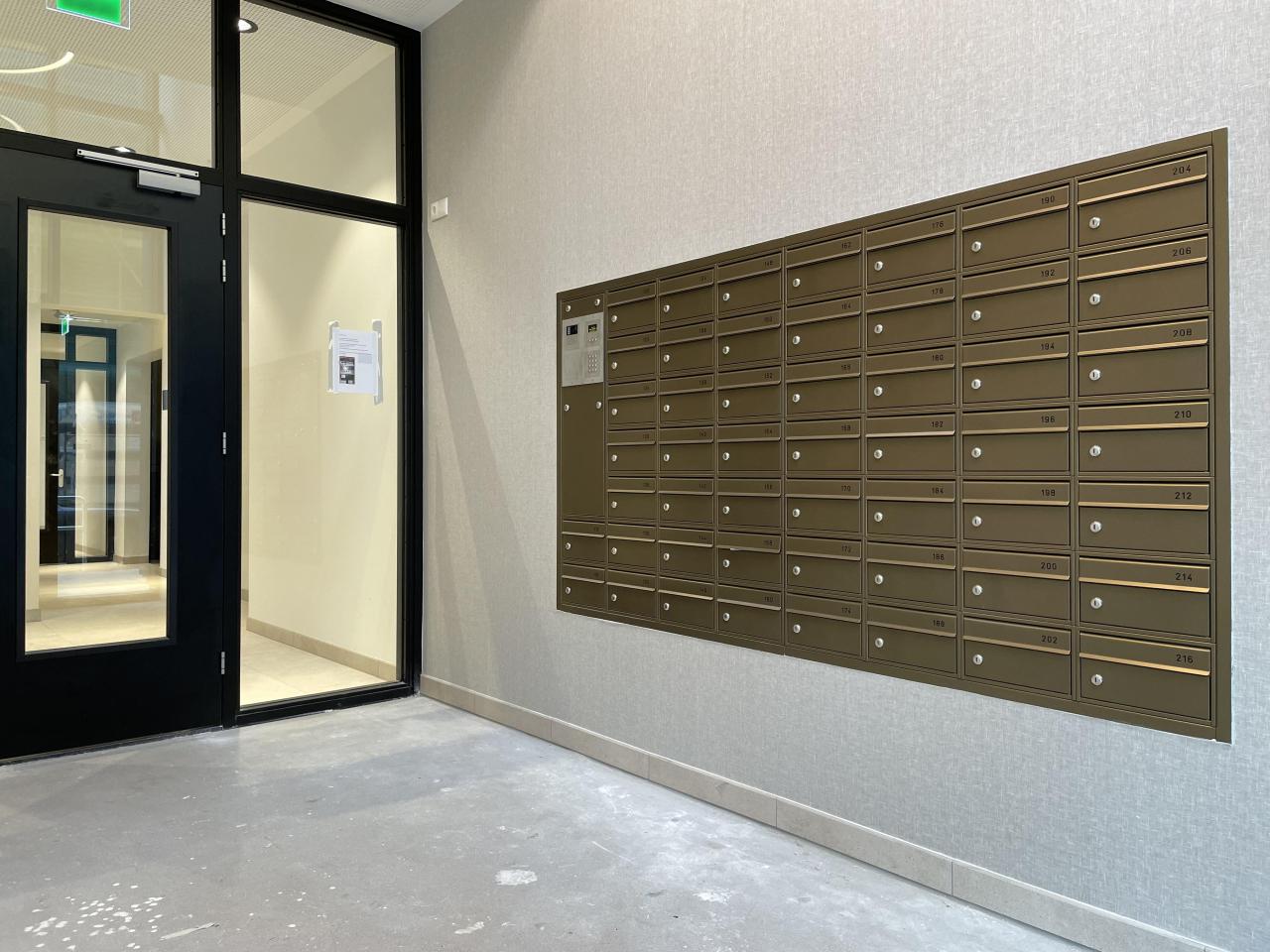 Begane grond: Hoofdentree met bellentableau en brievenbussen. Middels de glazen schuifdeuren is de trap of lift naar de gewenste verdieping te bereiken.