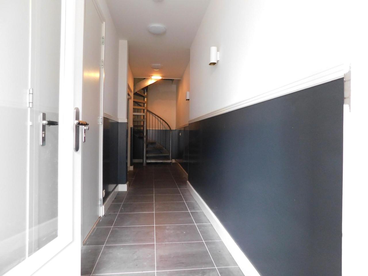 Eerste verdieping: Entree in de hal van het appartement. De gave PVC vissengraat-vloer loopt door vanuit de hal naar de woonkamer. De woonkamer is heerlijk ruim en de grote raampartijen zorgen voor een prachtige lichtinval. Vanuit hier heeft u een leuk uitzicht op de karakteristieke Grachtweg. Hier bevindt zich tevens de moderne open keuken, voorzien van allerhande inbouwapparatuur zoals een koel-/vriescombinatie, oven, combi-oven, vaatwasser en 5-pits gasfornuis met afzuigkap.